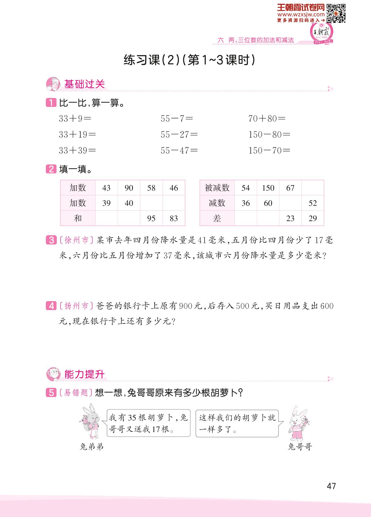 2023下册二年级数学苏教版 六 两、三位数的加法和减法——练习课(2)(第1~3课时)