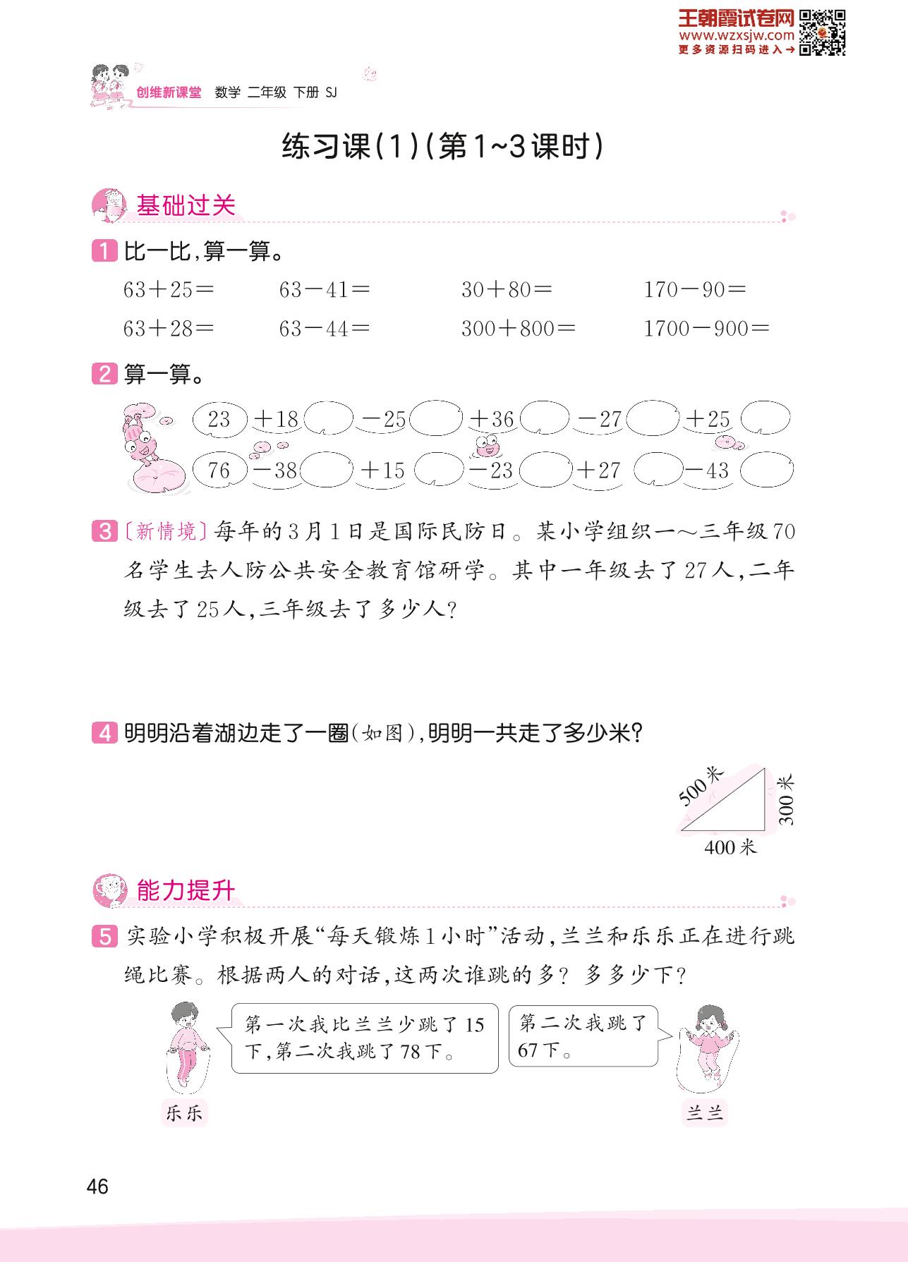 2023下册二年级数学苏教版 六 两、三位数的加法和减法——练习课(1)(第1~3课时)