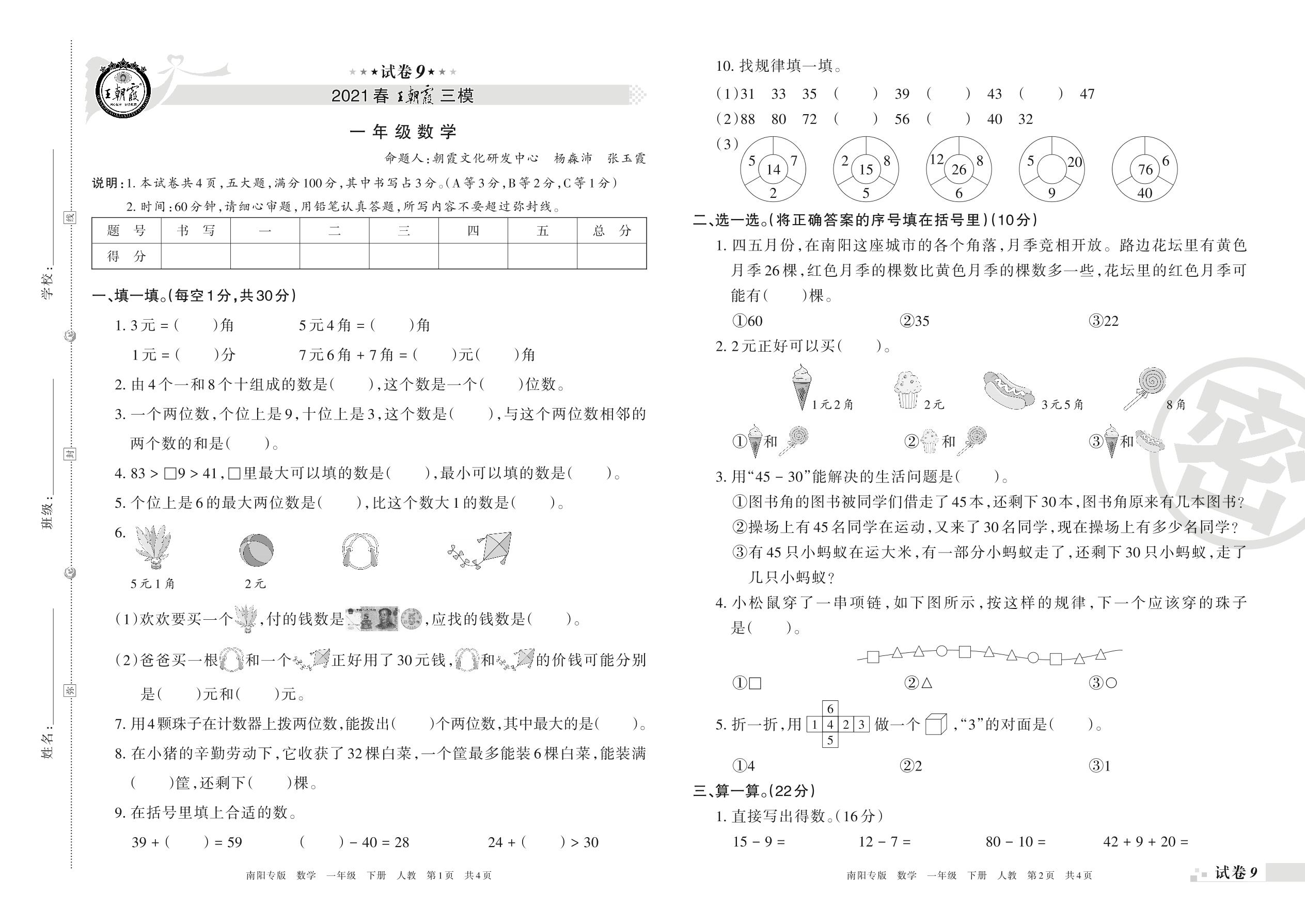 王朝霞期末模拟卷一年级下册数学(人教版)_R210802210141【9】