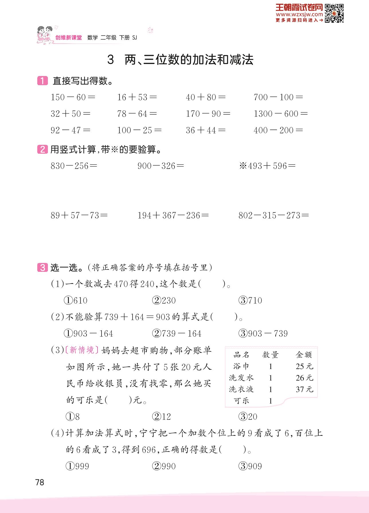 2023下册二年级数学苏教版 九 期末复习——3 两、三位数的加法和减法