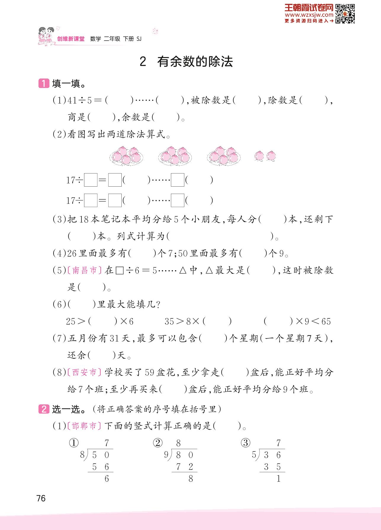 2023下册二年级数学苏教版 九 期末复习——2 有余数的除法