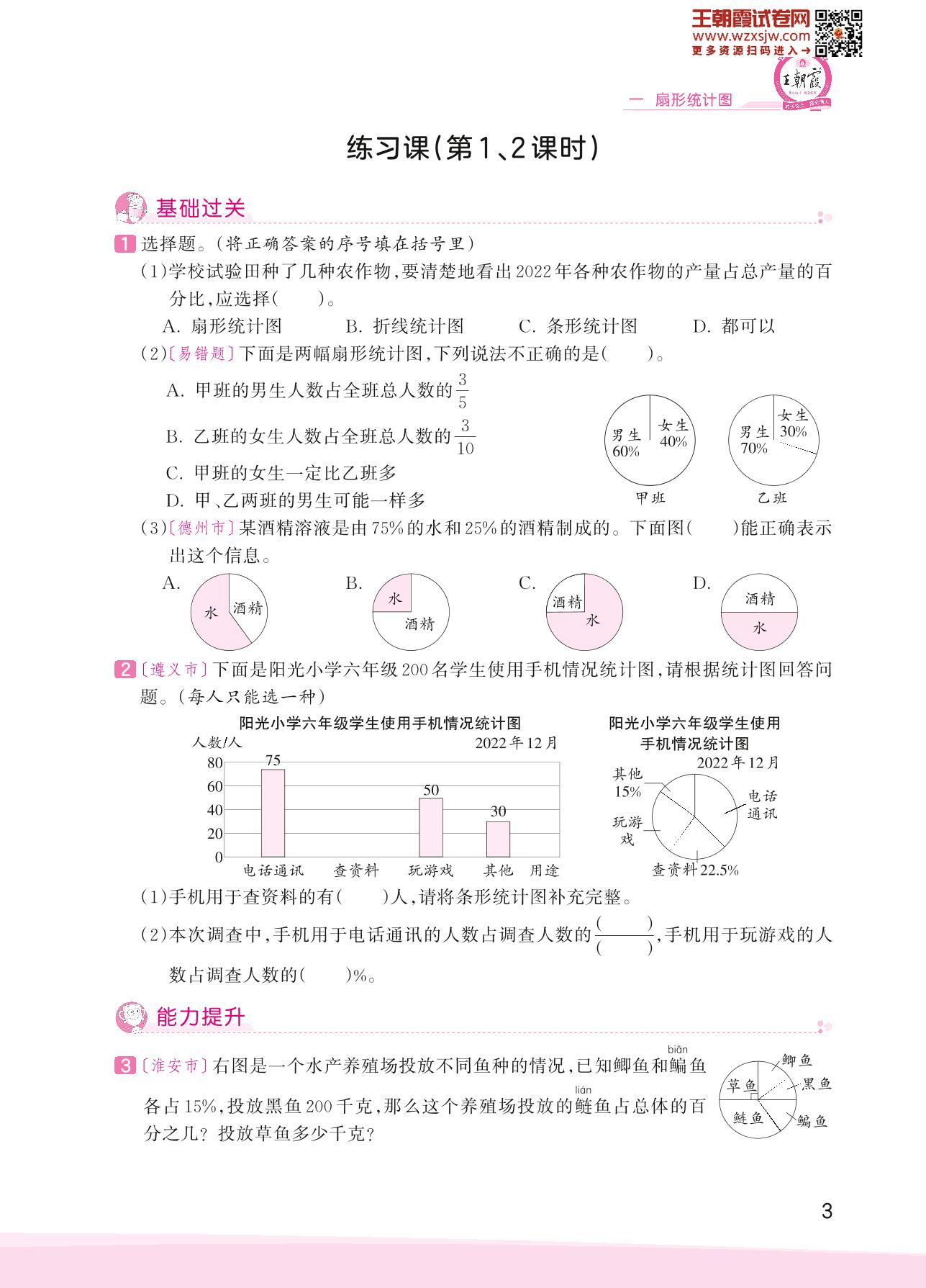 2023下册六年级数学苏教版 一 扇形统计图——练习课(第1、2课时)