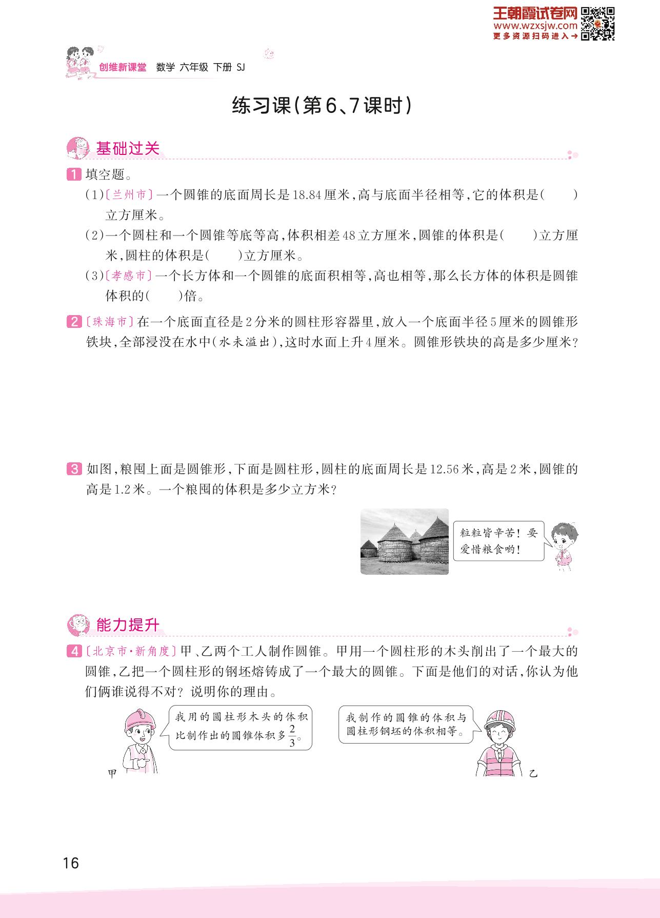 2023下册六年级数学苏教版 二 圆柱和圆锥——练习课(第6、7课时)