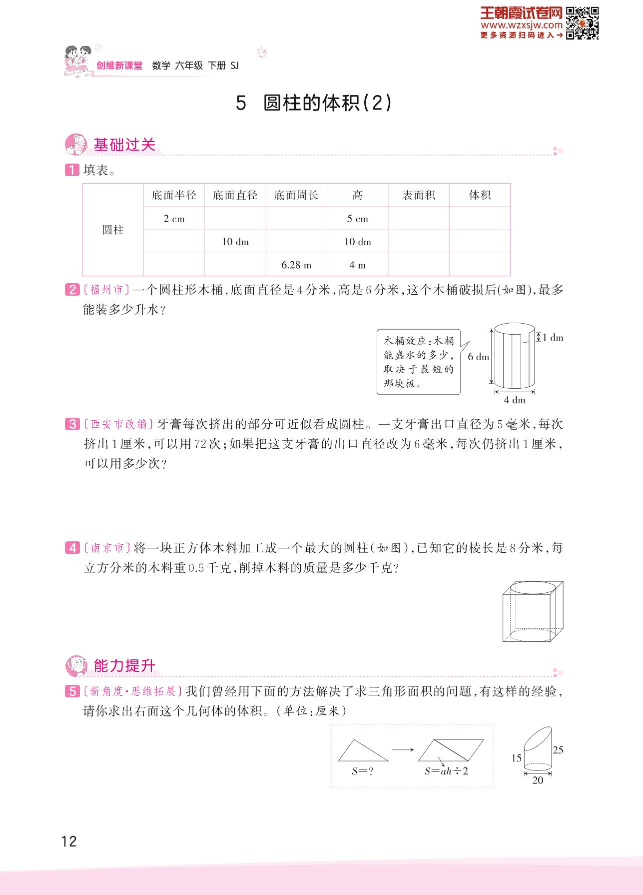 2023下册六年级数学苏教版 二 圆柱和圆锥——5 圆柱的体积(2)