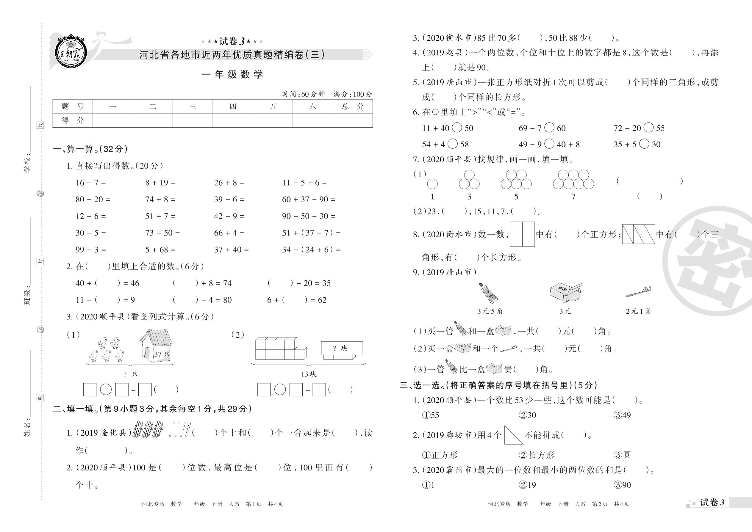 王朝霞海淘期末精编卷一年级下册数学(人教版)【3】