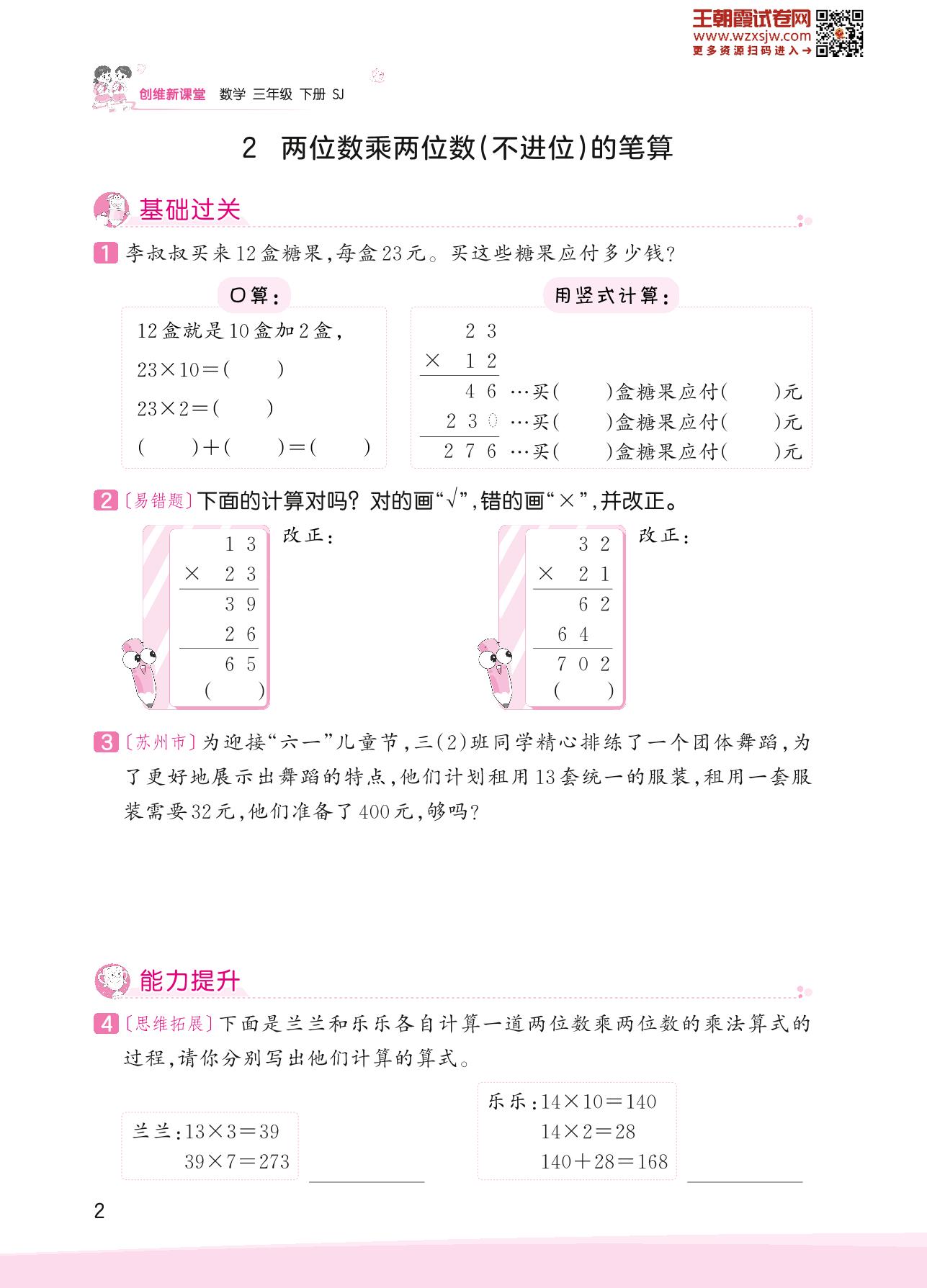2023下册三年级数学苏教版 一 两位数乘两位数——2 两位数乘两位数(不进位)的笔算