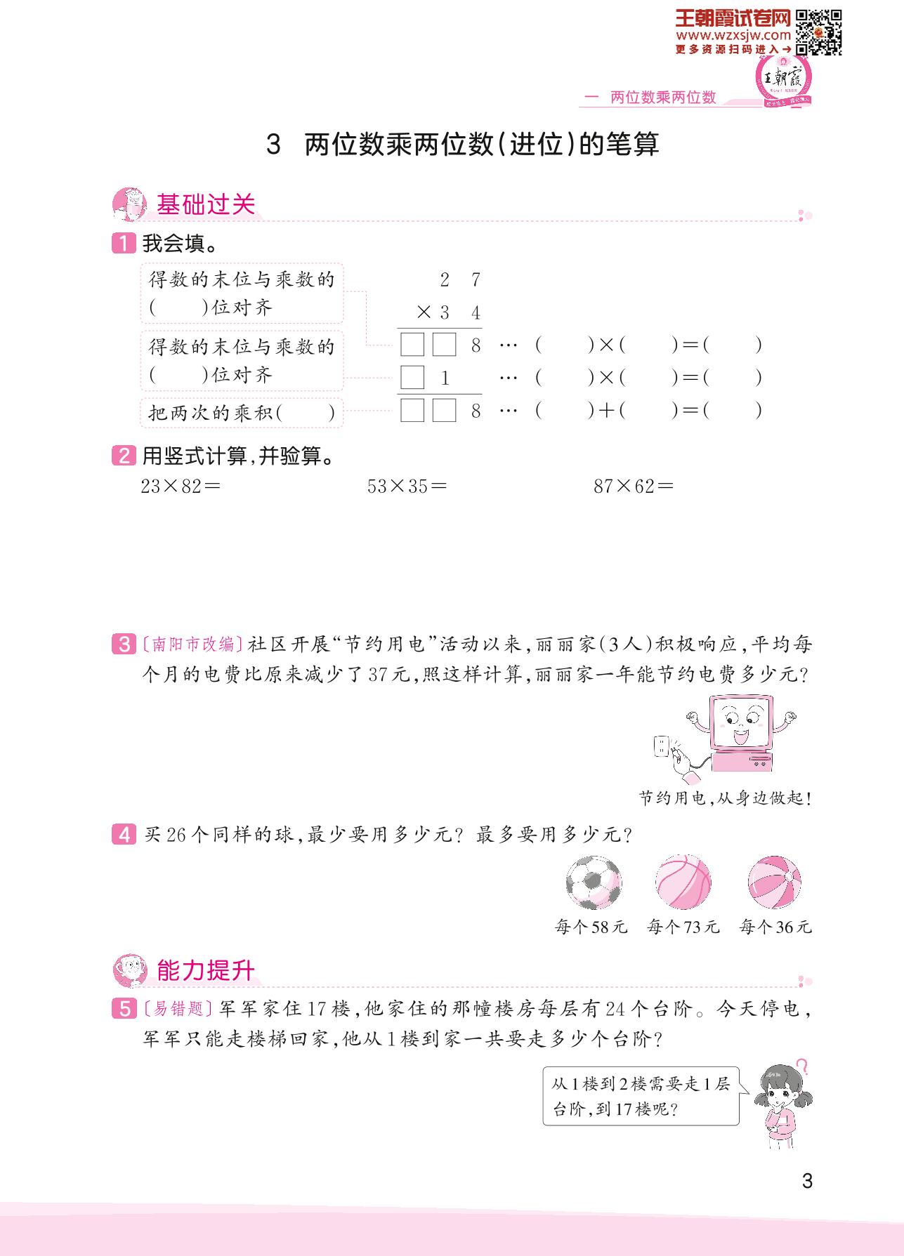 2023下册三年级数学苏教版 一 两位数乘两位数——3 两位数乘两位数(进位)的笔算