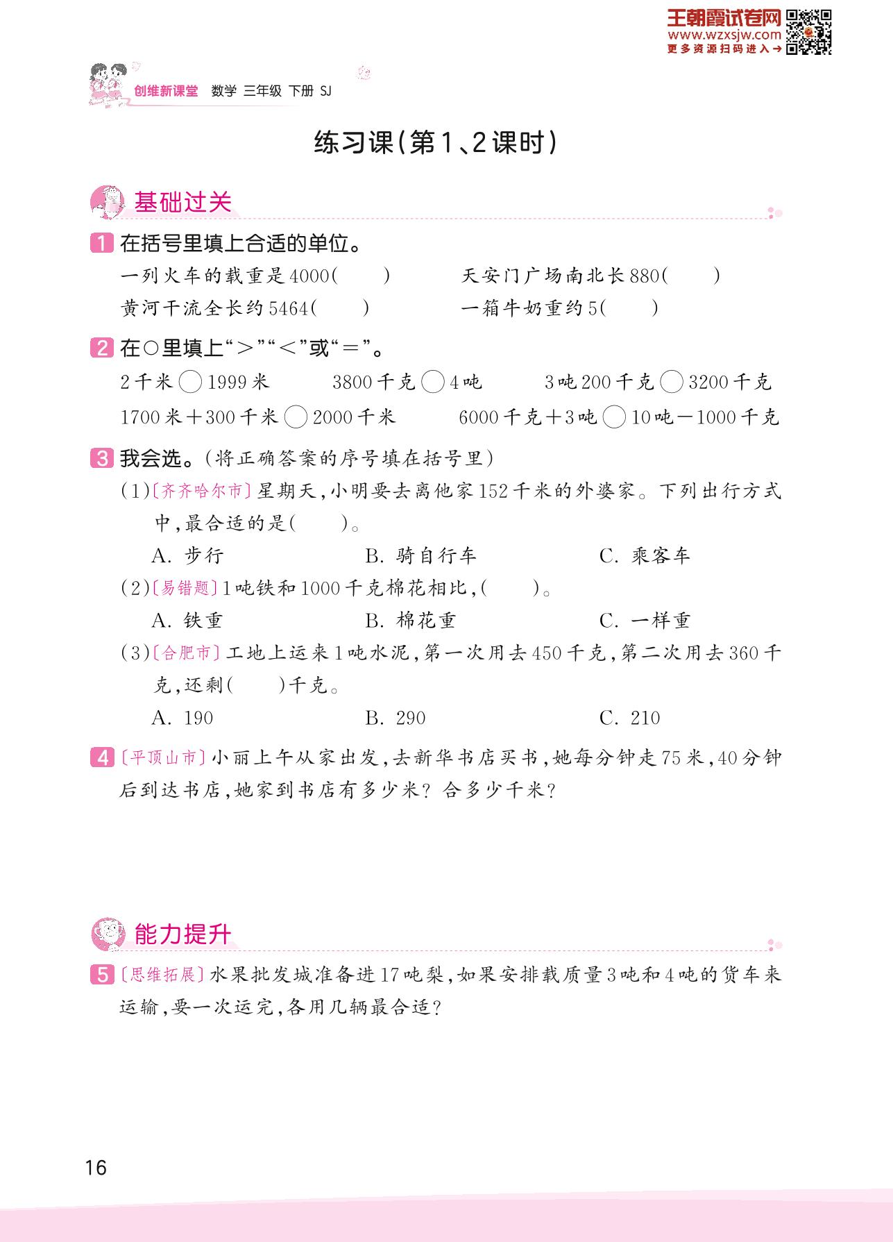 2023下册三年级数学苏教版 二 千米和吨——练习课(第1、2课时)