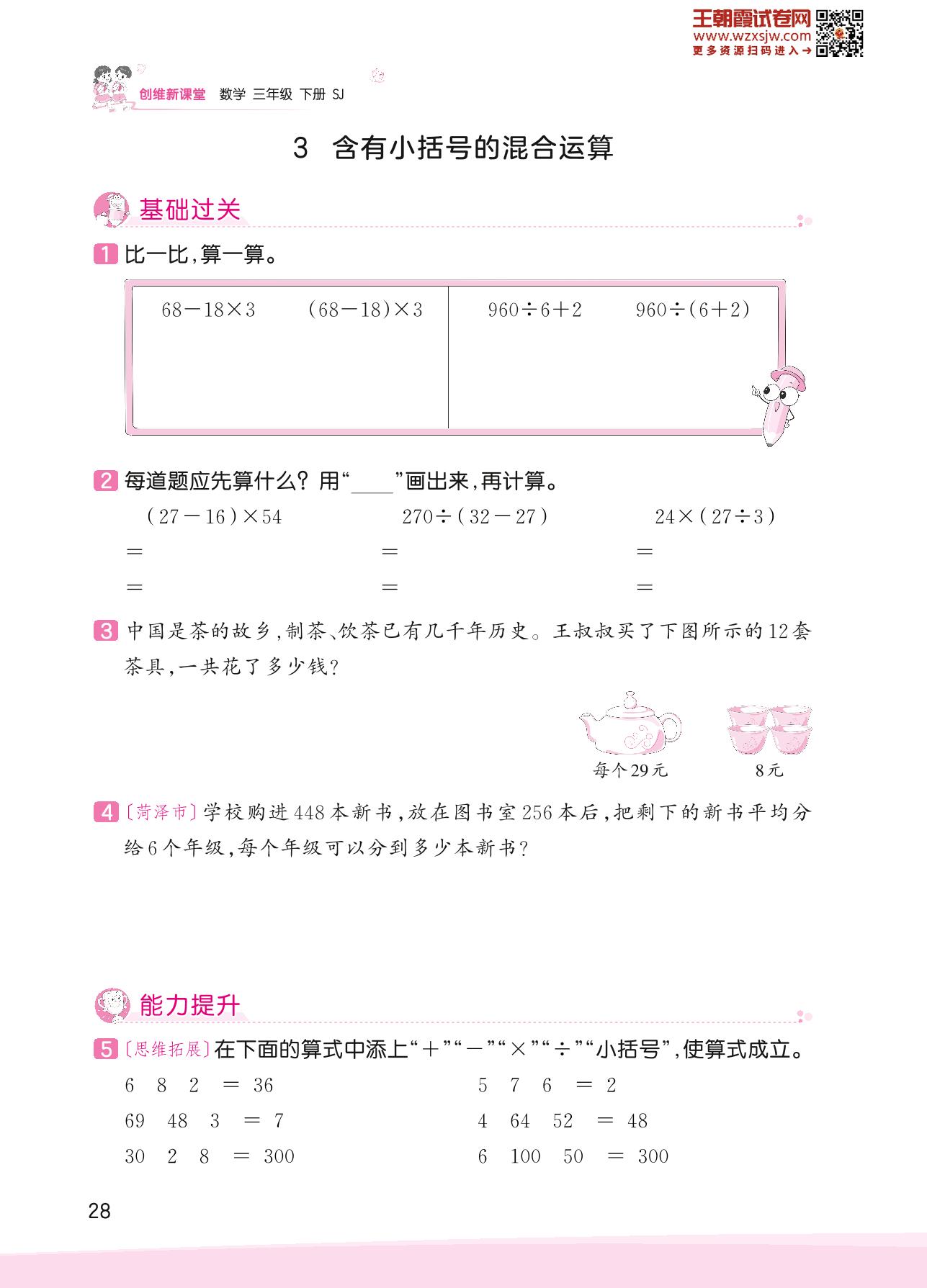 2023下册三年级数学苏教版 四 混合运算——3 含有小括号的混合运算