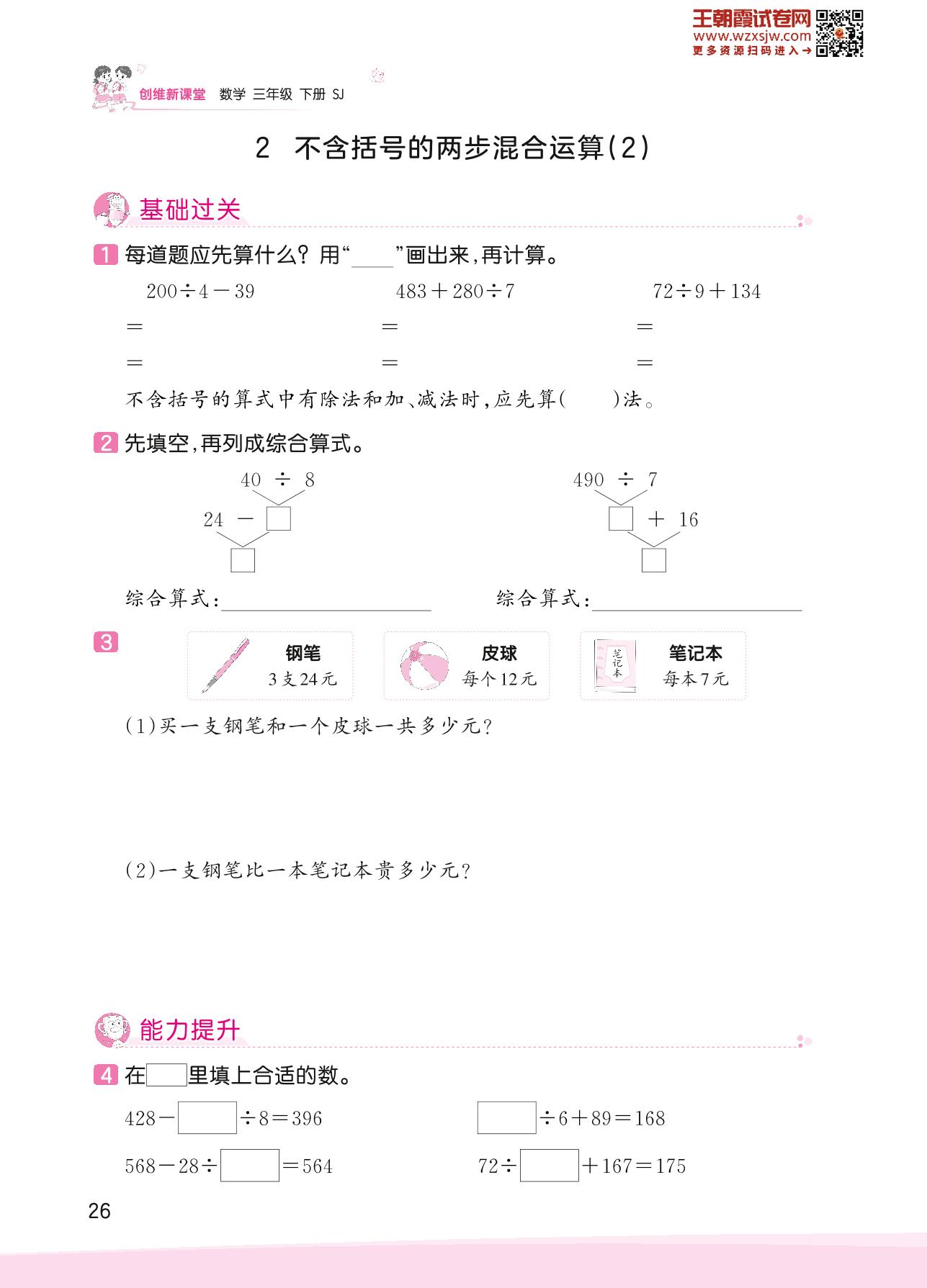 2023下册三年级数学苏教版 四 混合运算——2 不含括号的两步混合运算(2)