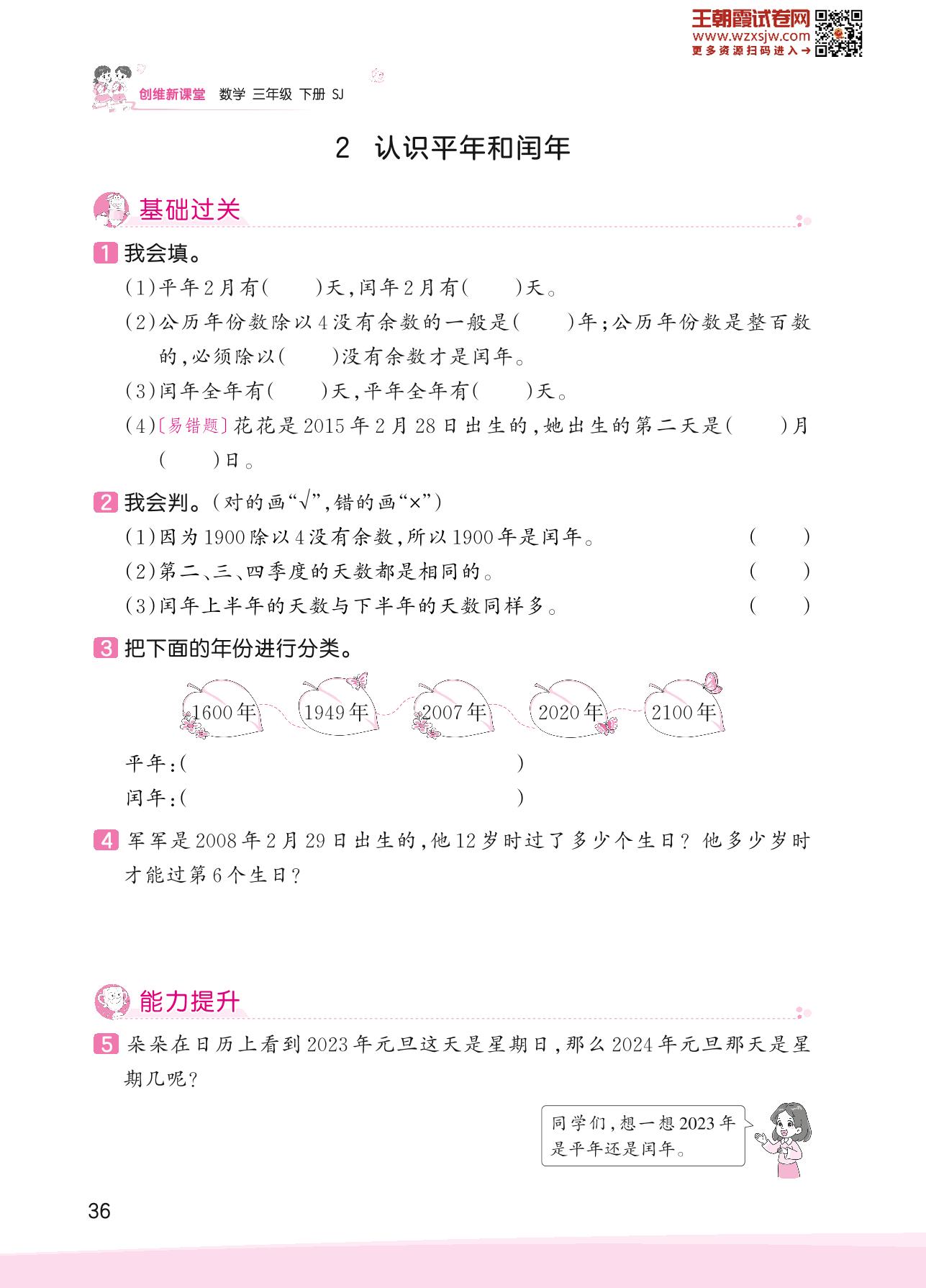2023下册三年级数学苏教版 五 年、月、日——2 认识平年和闰年