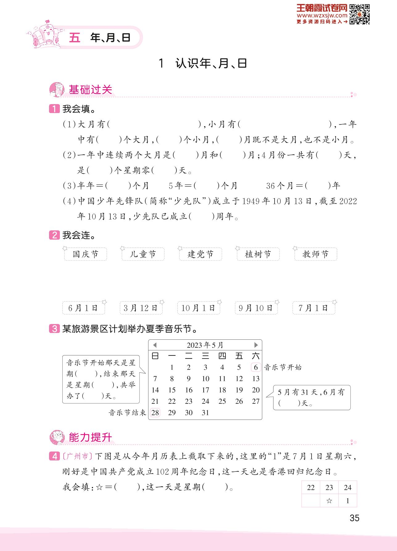 2023下册三年级数学苏教版 五 年、月、日——1 认识年、月、日