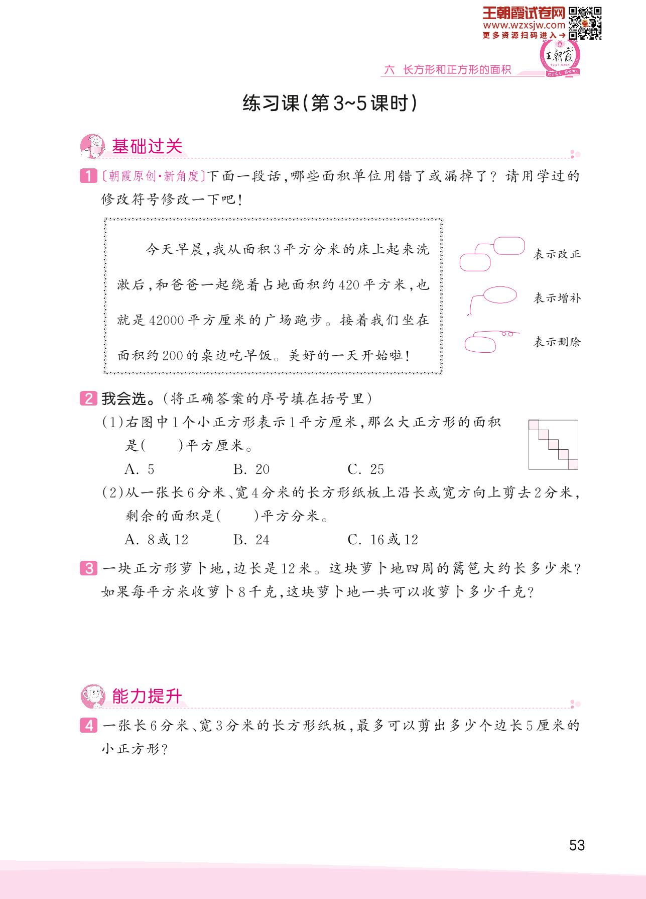 2023下册三年级数学苏教版 六 长方形和正方形的面积——练习课(第3~5课时)