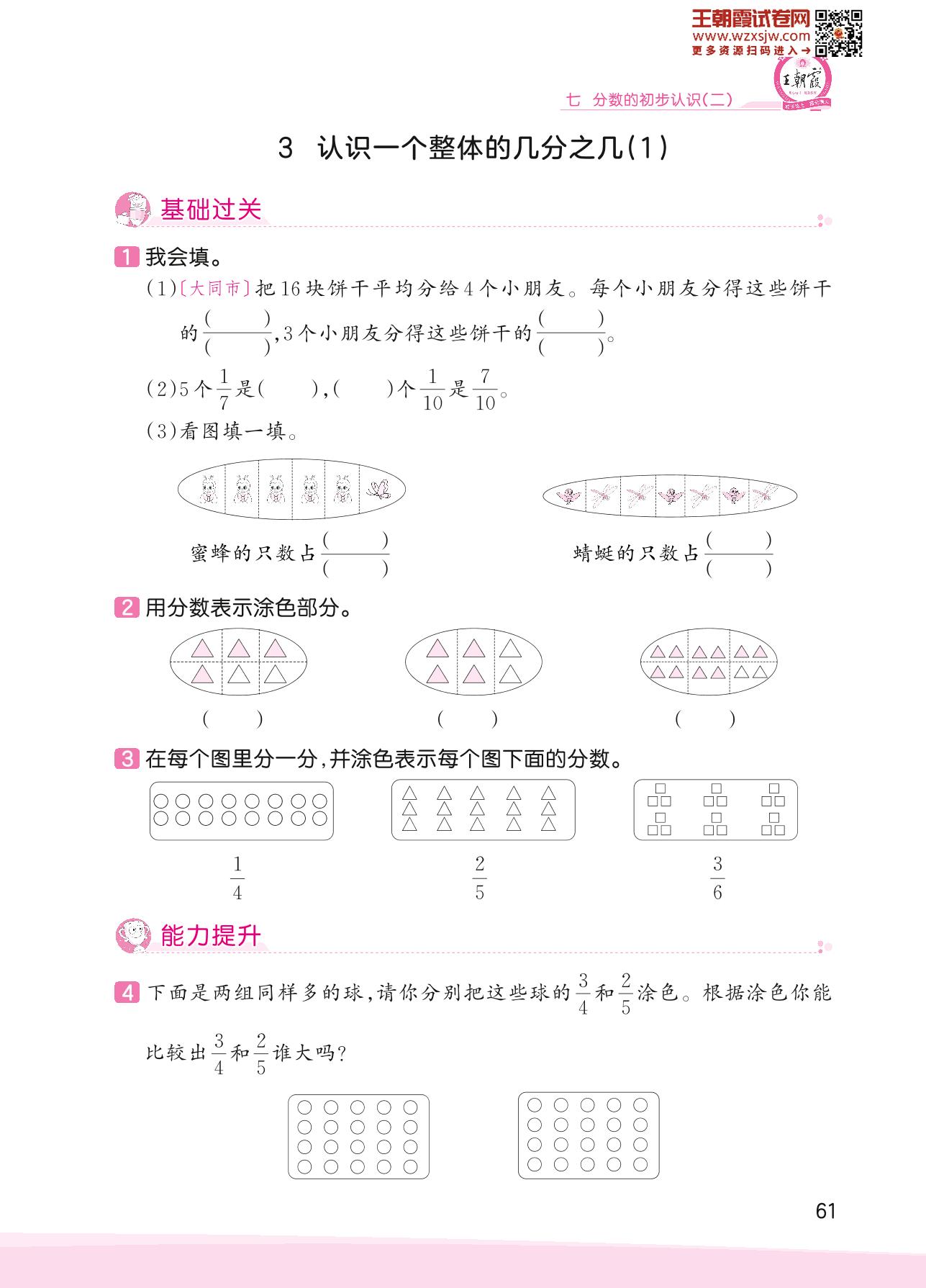 2023下册三年级数学苏教版 七 分数的初步认识(二)——3 认识一个整体的几分之几(1)
