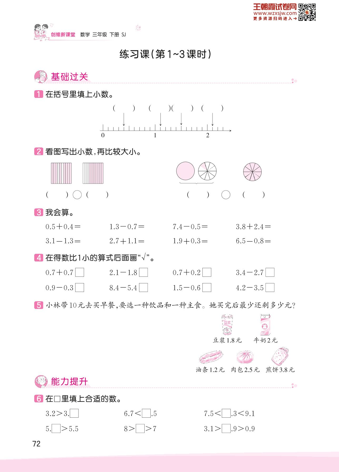 2023下册三年级数学苏教版 八 小数的初步认识——练习课(第1~3课时)