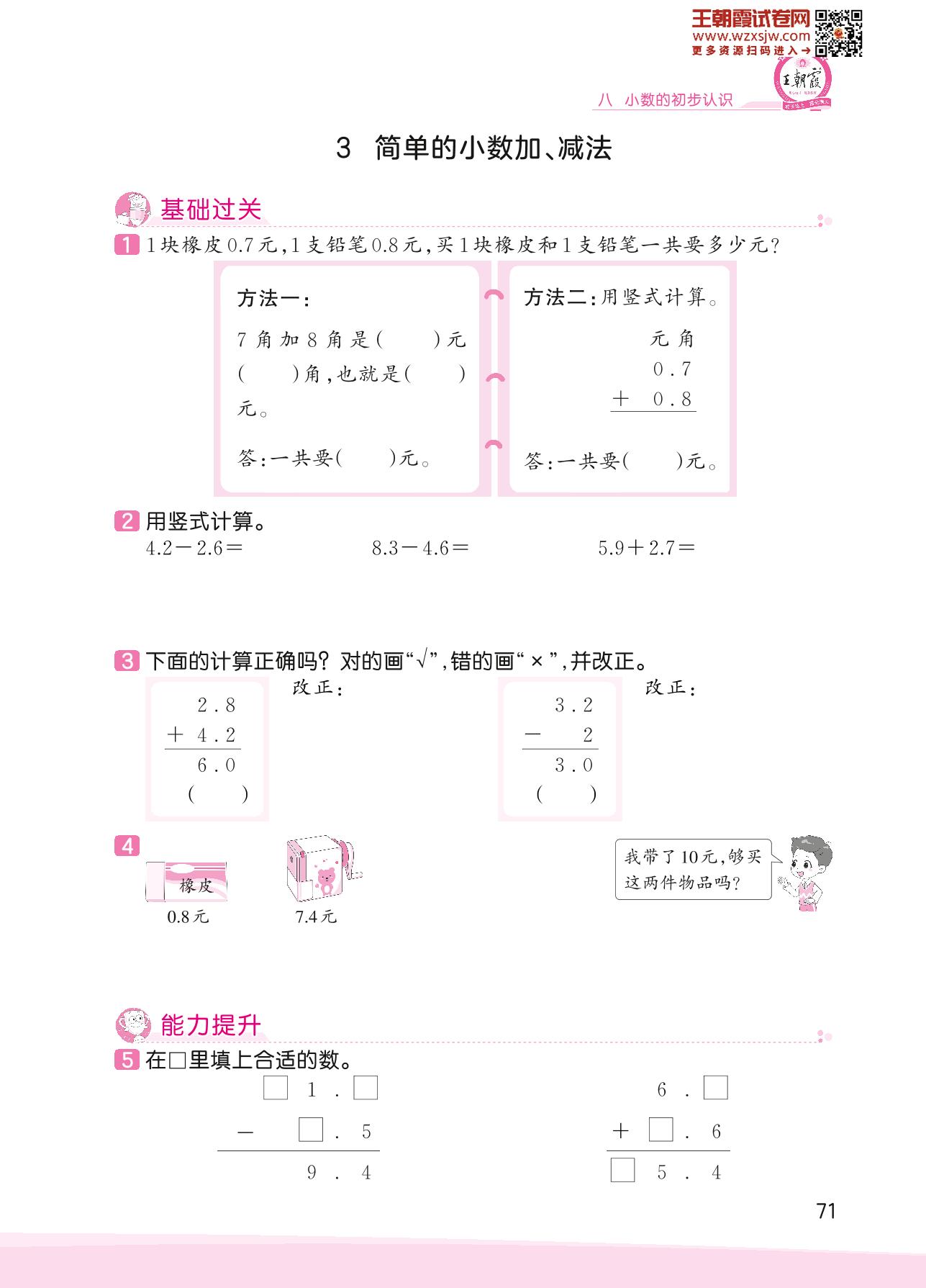 2023下册三年级数学苏教版 八 小数的初步认识——3 简单的小数加、减法