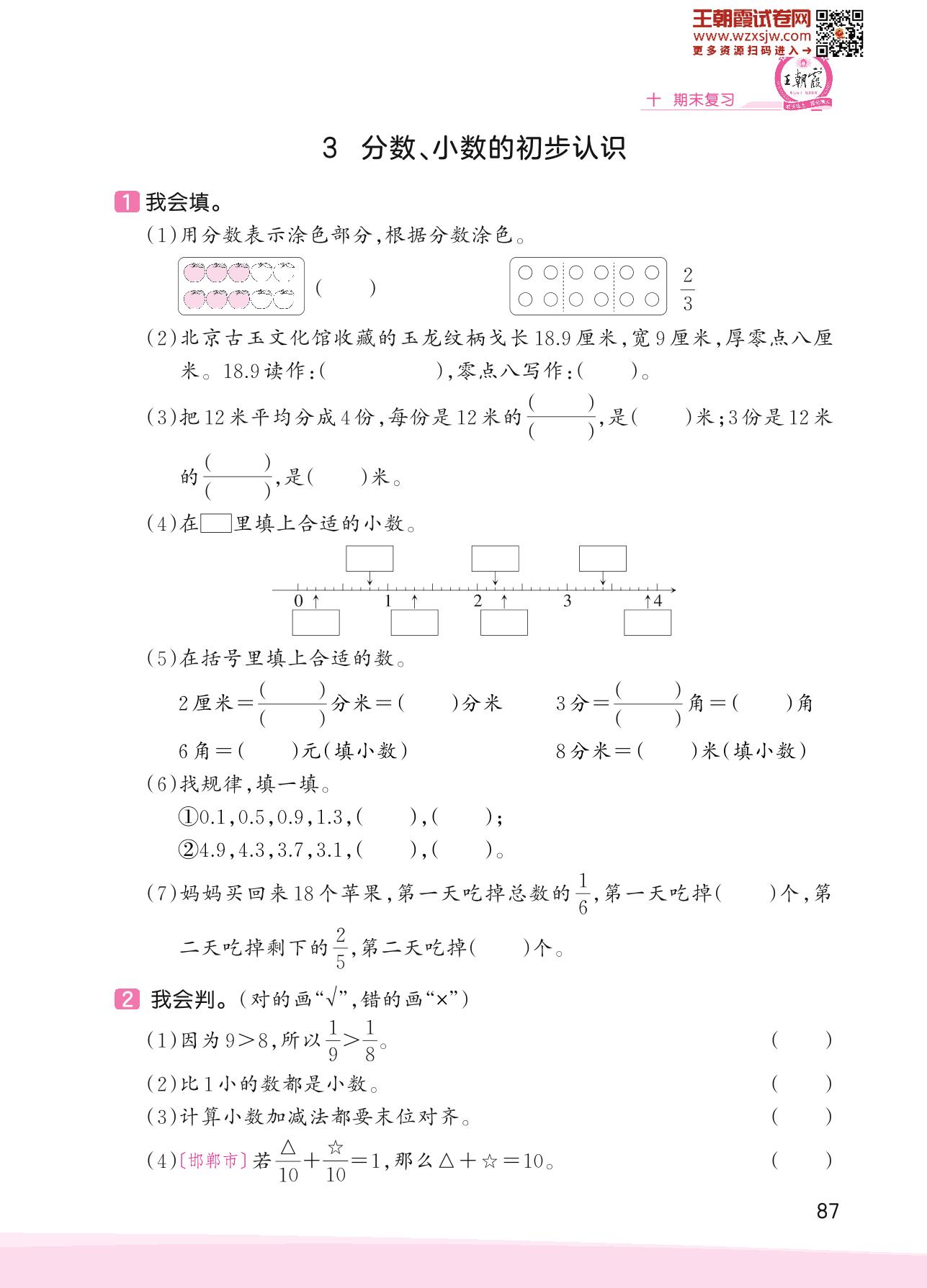 2023下册三年级数学苏教版 十 期末复习——3 分数、小数的初步认识
