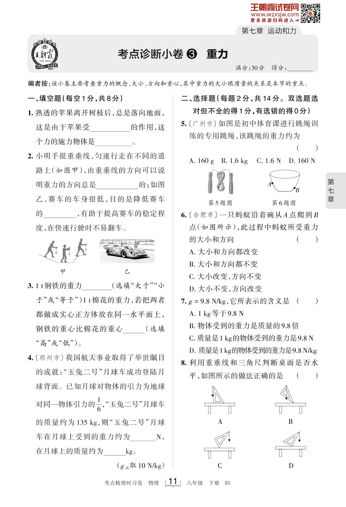 2023下册八年级物理北师版 第七章 考点诊断小卷3 重力
