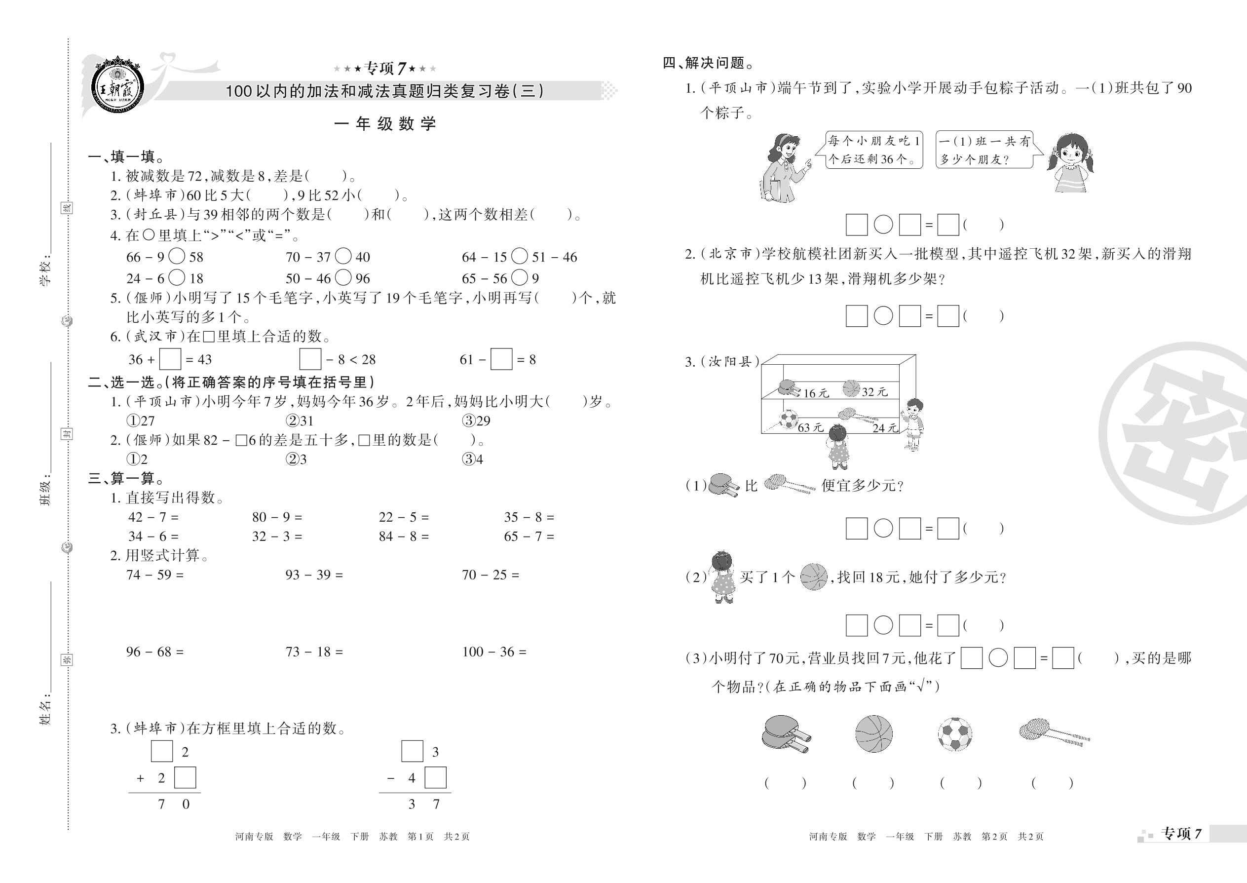 王朝霞期末专项卷——100以内的加法和减法真题归类复习、新颖题速递:生活与数学一年级下册数学(苏教版)【0】