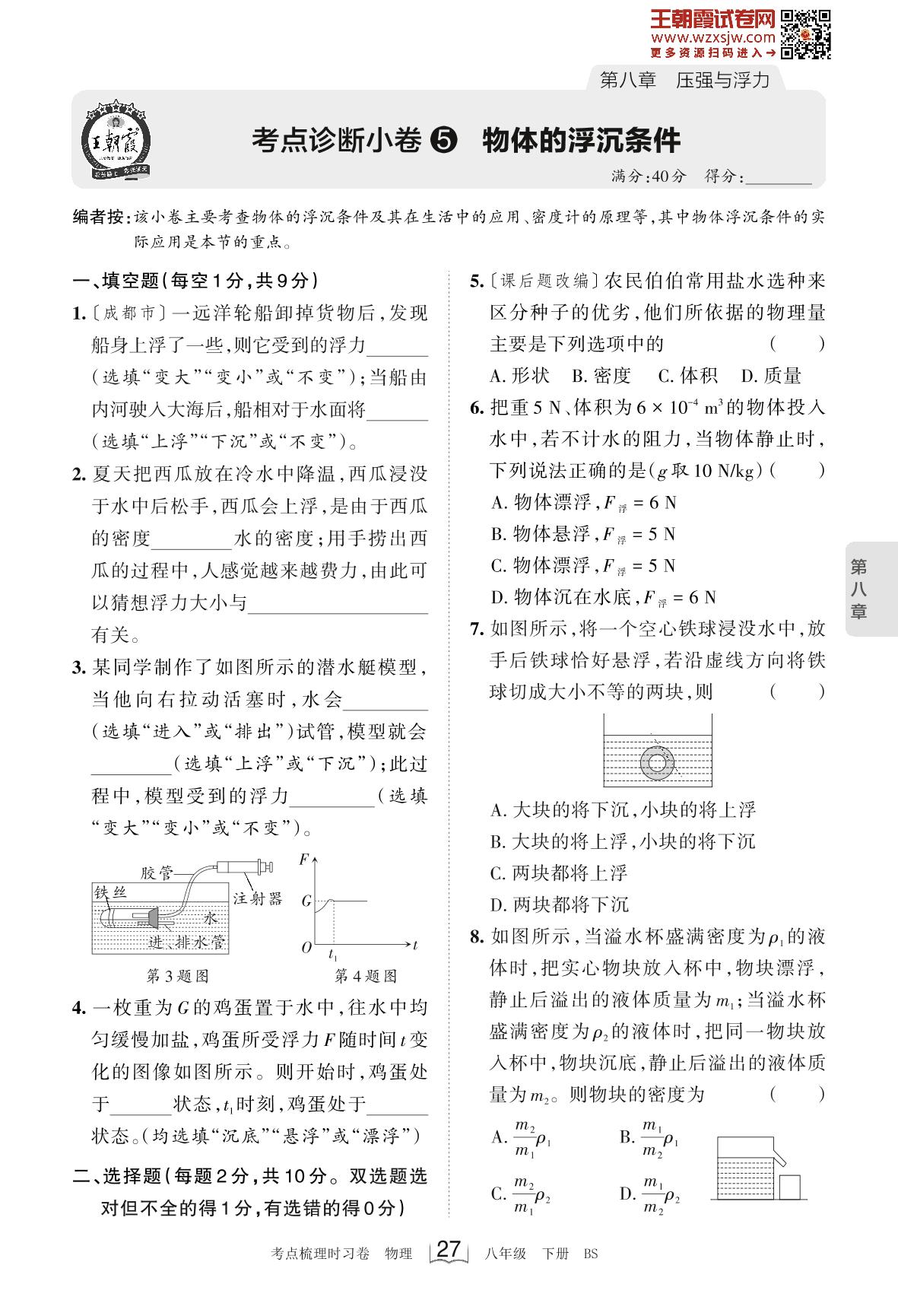 2023下册八年级物理北师版 第八章 考点诊断小卷5 物体的浮沉条件