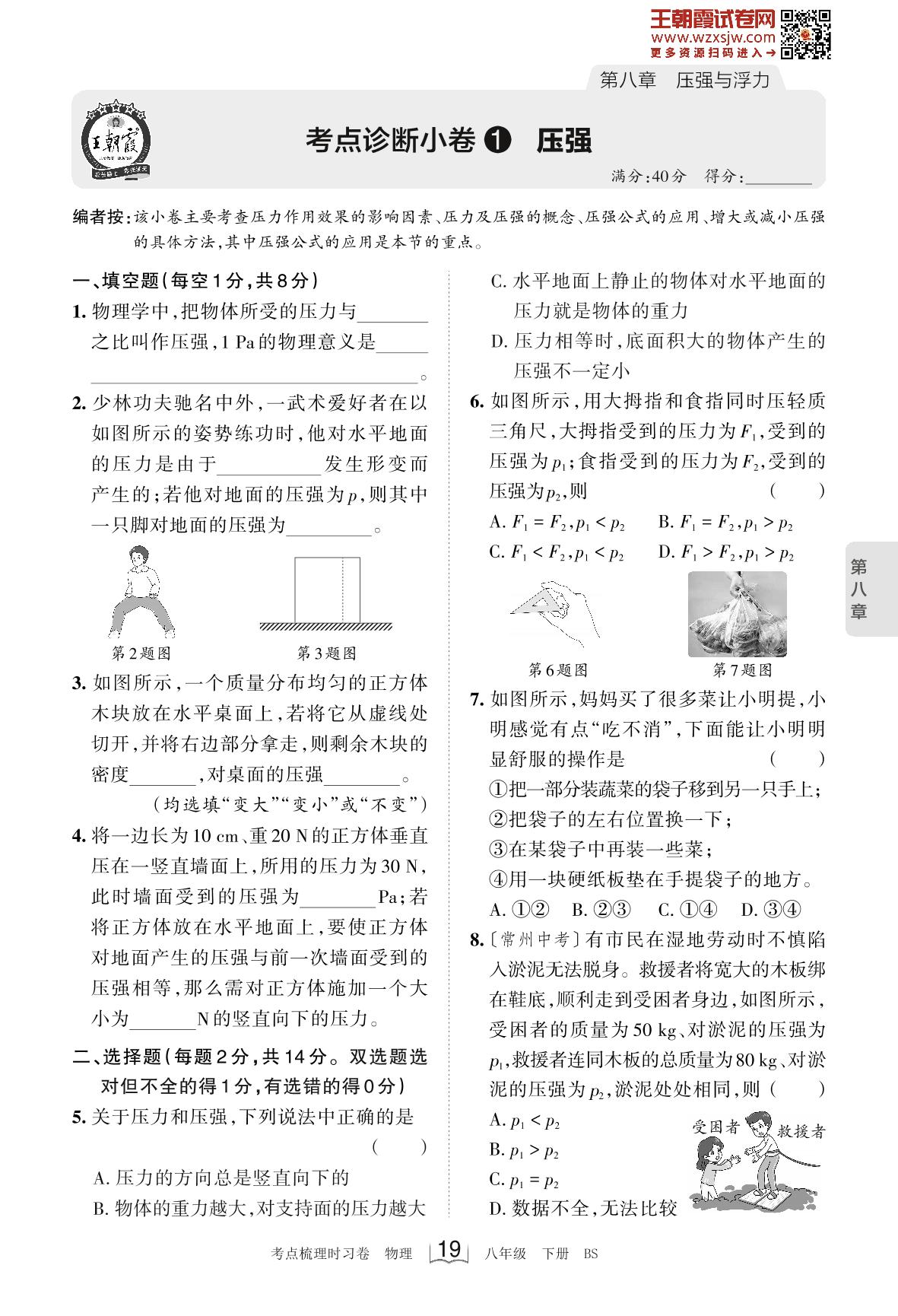 2023下册八年级物理北师版 第八章 考点诊断小卷1 压强