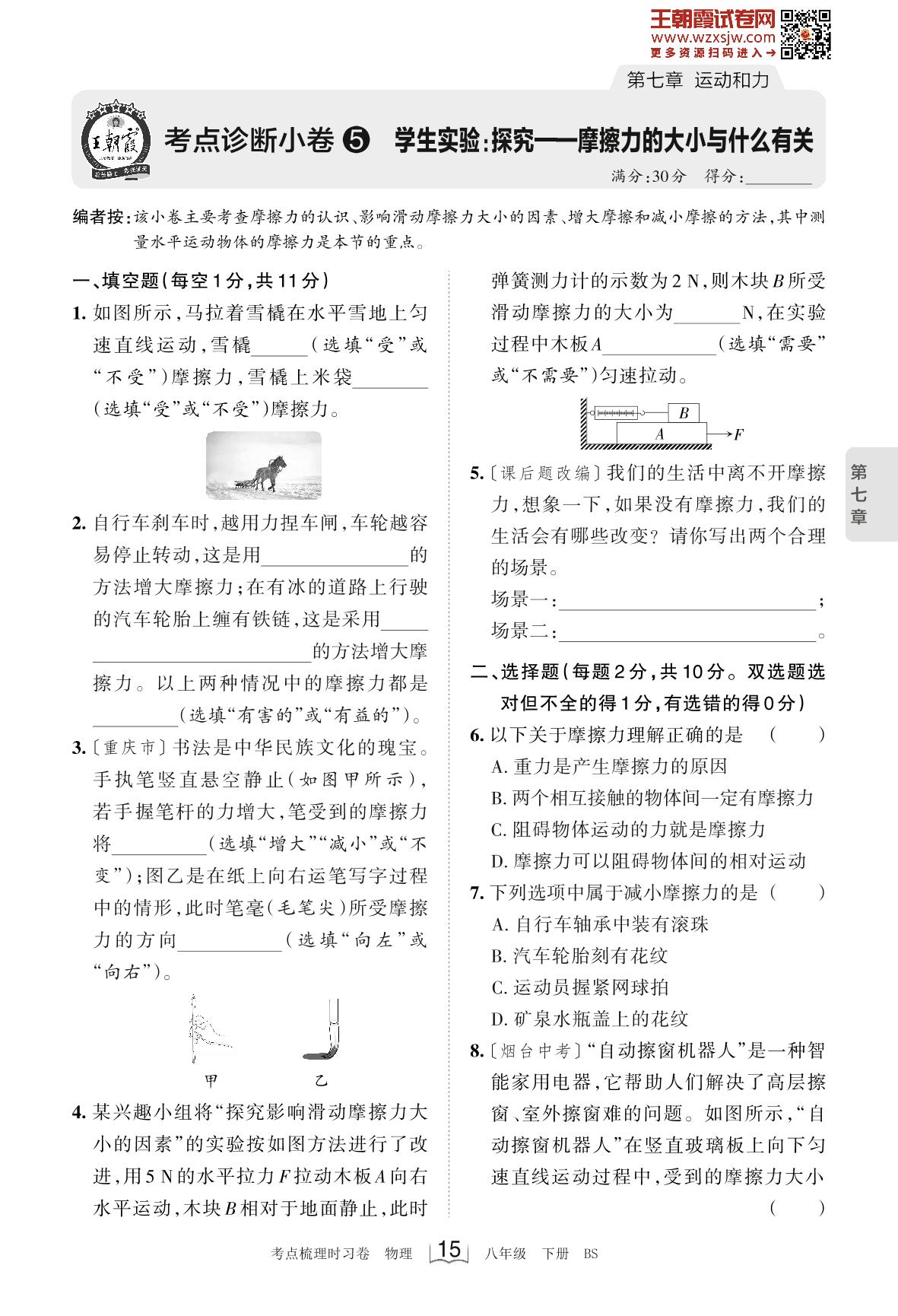 2023下册八年级物理北师版 第七章 考点诊断小卷5 学生实验:探究——摩擦力的大小与什么有关