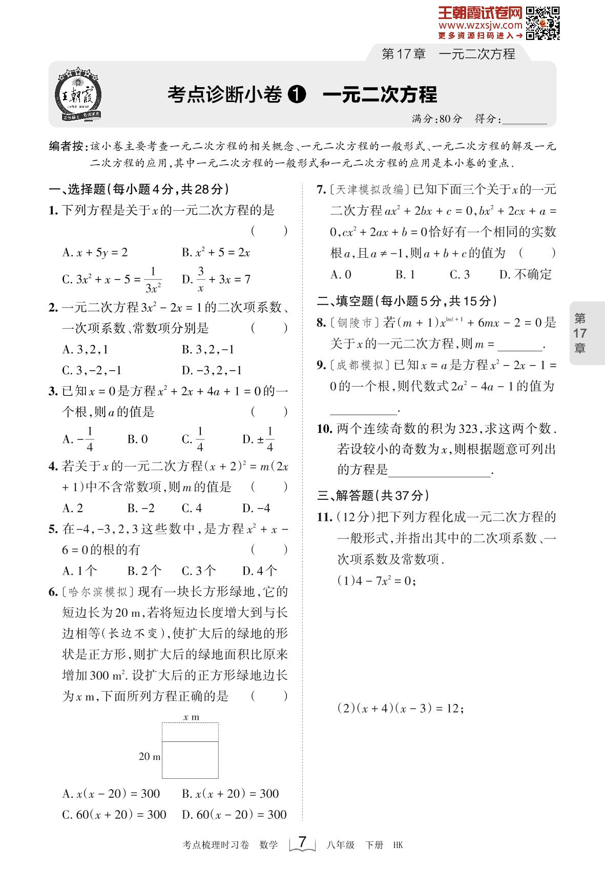2023下册八年级数学沪科版 第17章 考点诊断小卷1 一元二次方程