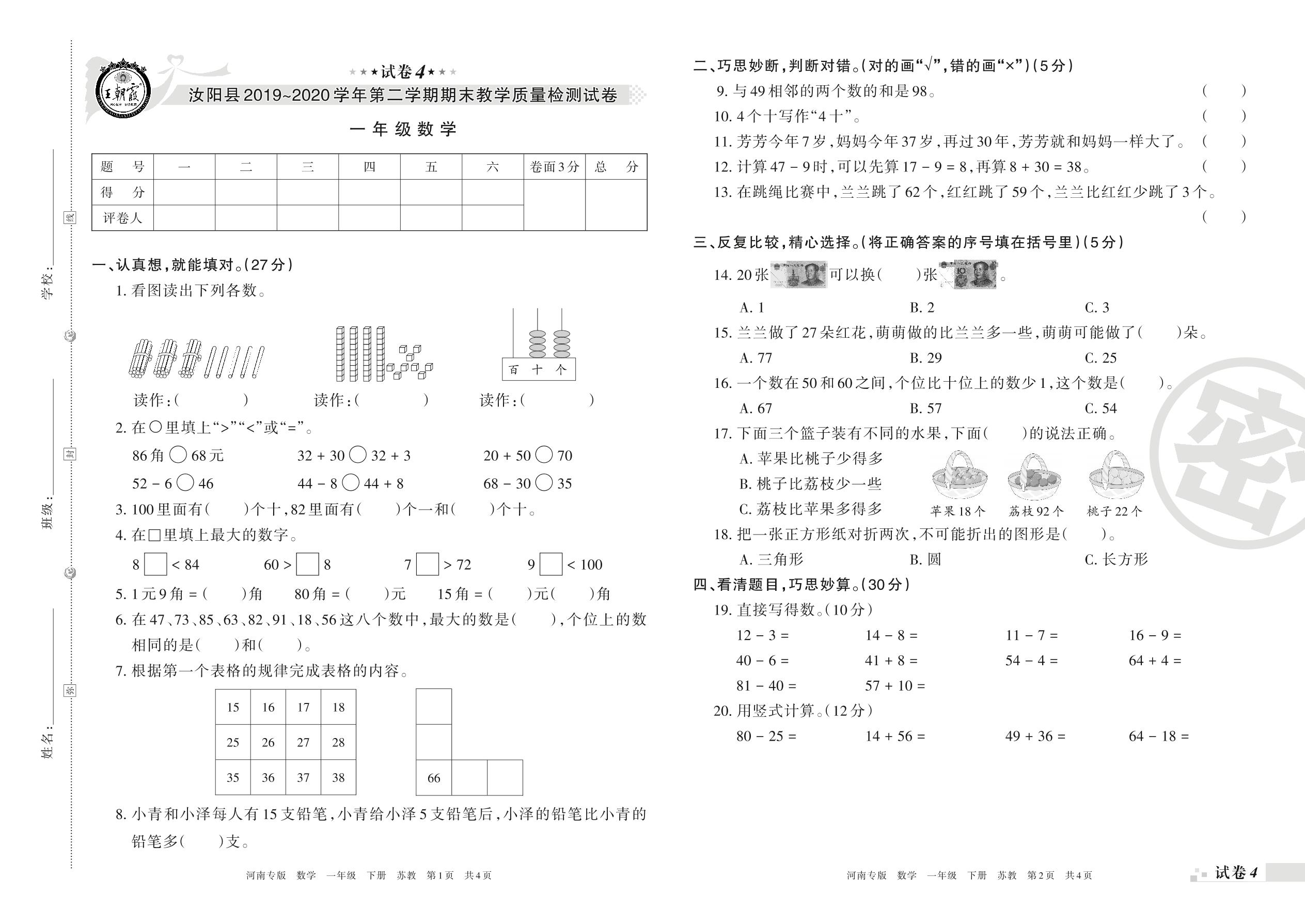 2019-2020学年第二学期洛阳市汝阳县一年级数学试卷(苏教版)【4】