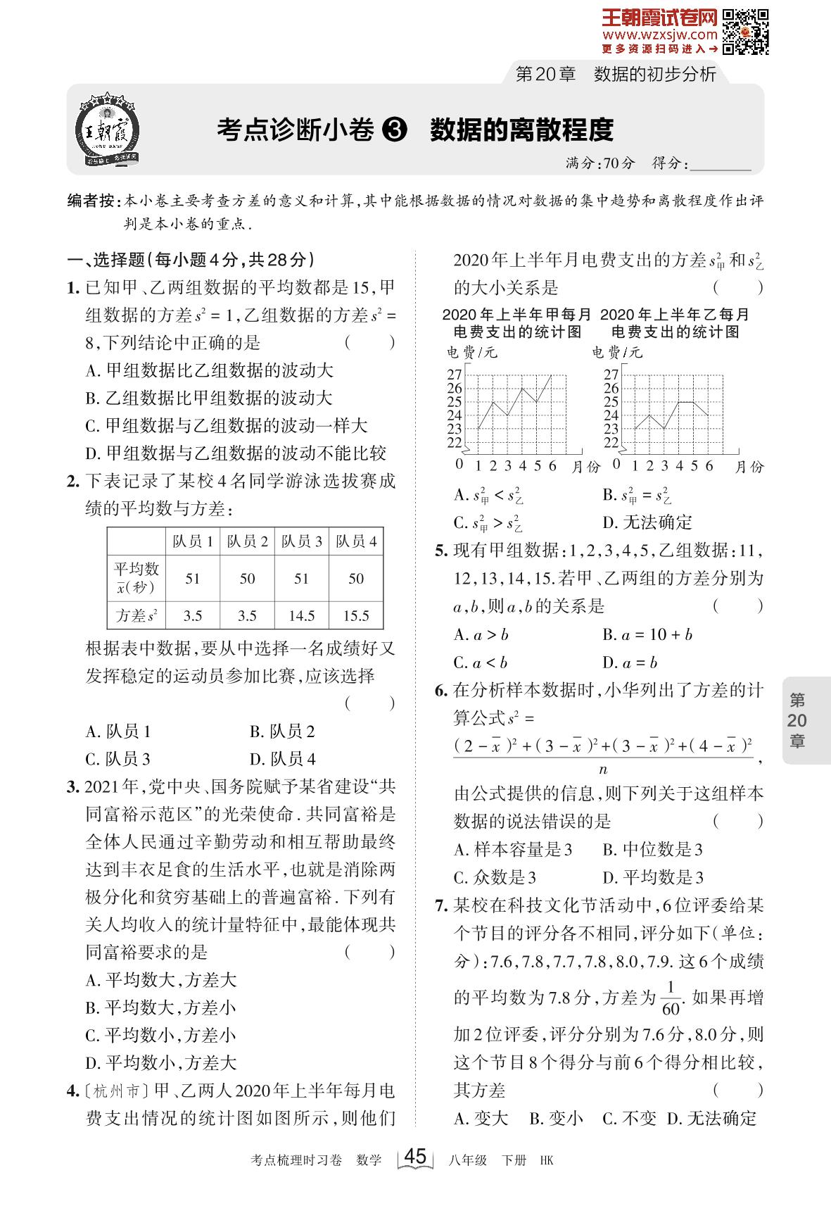 2023下册八年级数学沪科版 第20章 考点诊断小卷3 数据的离散程度
