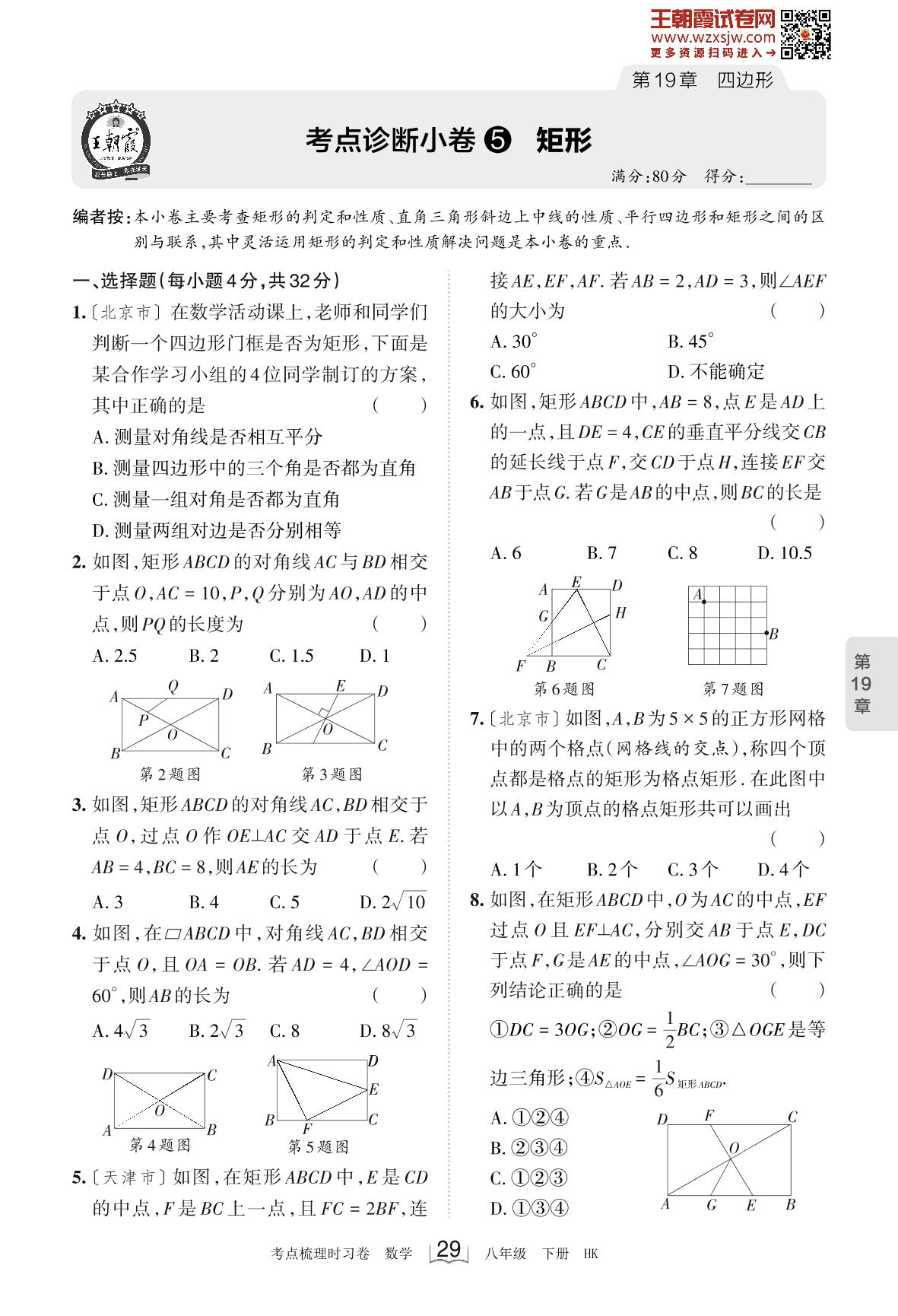 2023下册八年级数学沪科版 第19章 考点诊断小卷5 矩形