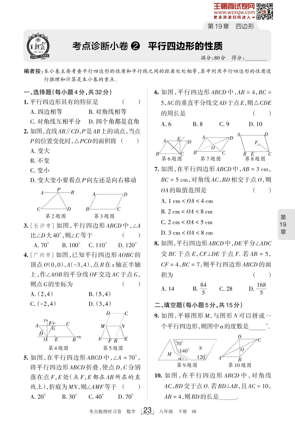 2023下册八年级数学沪科版 第19章 考点诊断小卷2 平行四边形的性质
