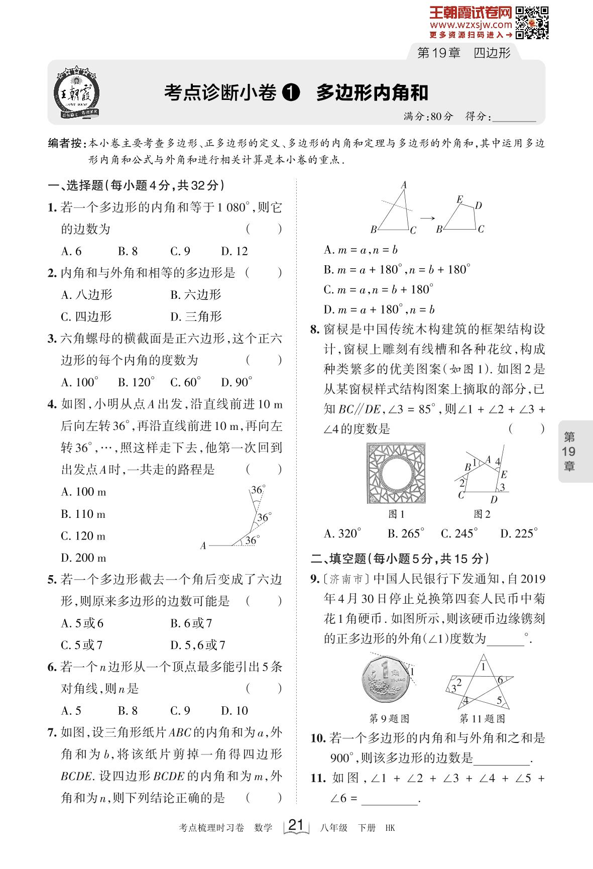 2023下册八年级数学沪科版 第19章 考点诊断小卷1 多边形内角和