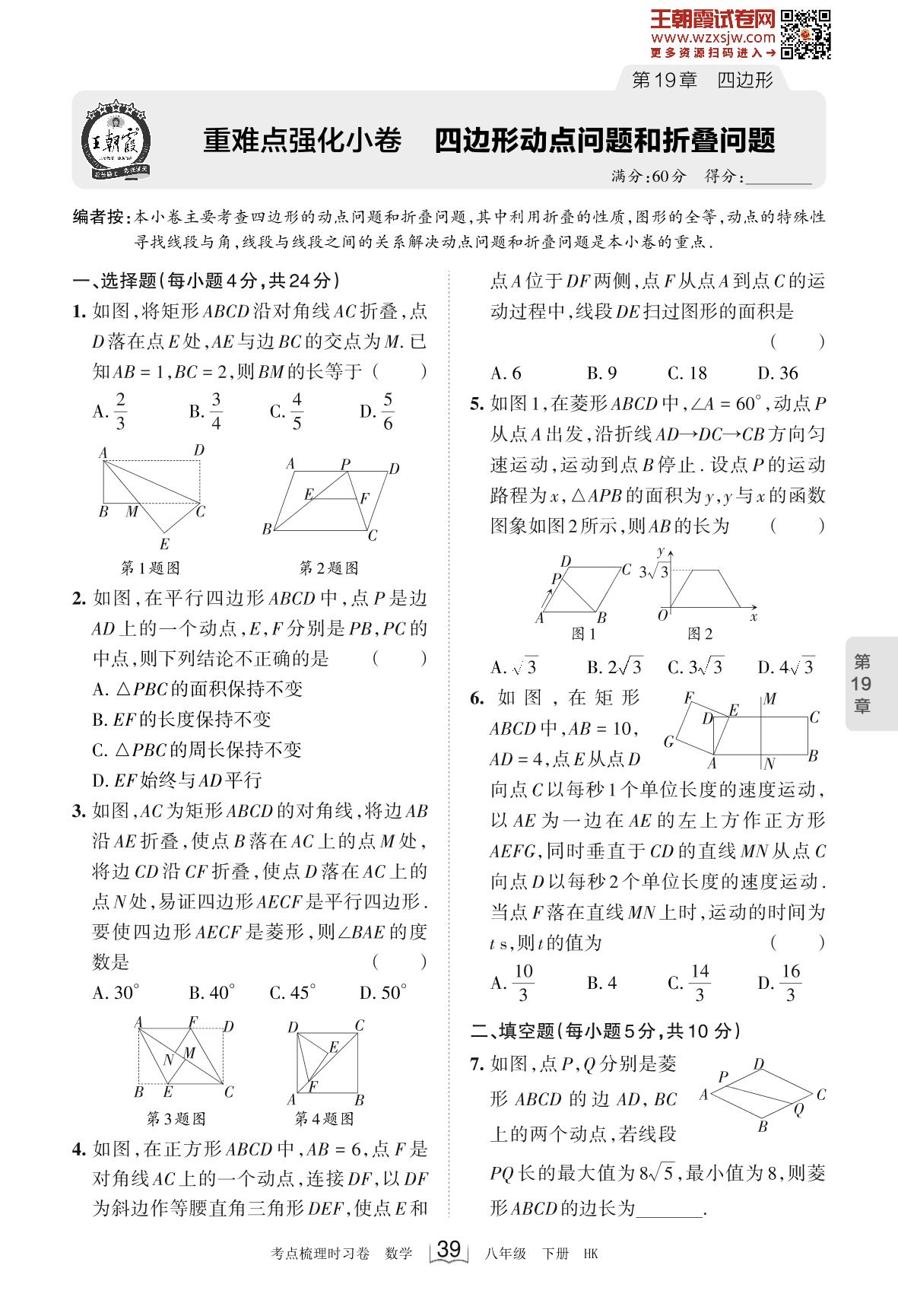 2023下册八年级数学沪科版 第19章 重难点强化小卷 四边形动点问题和折叠问题