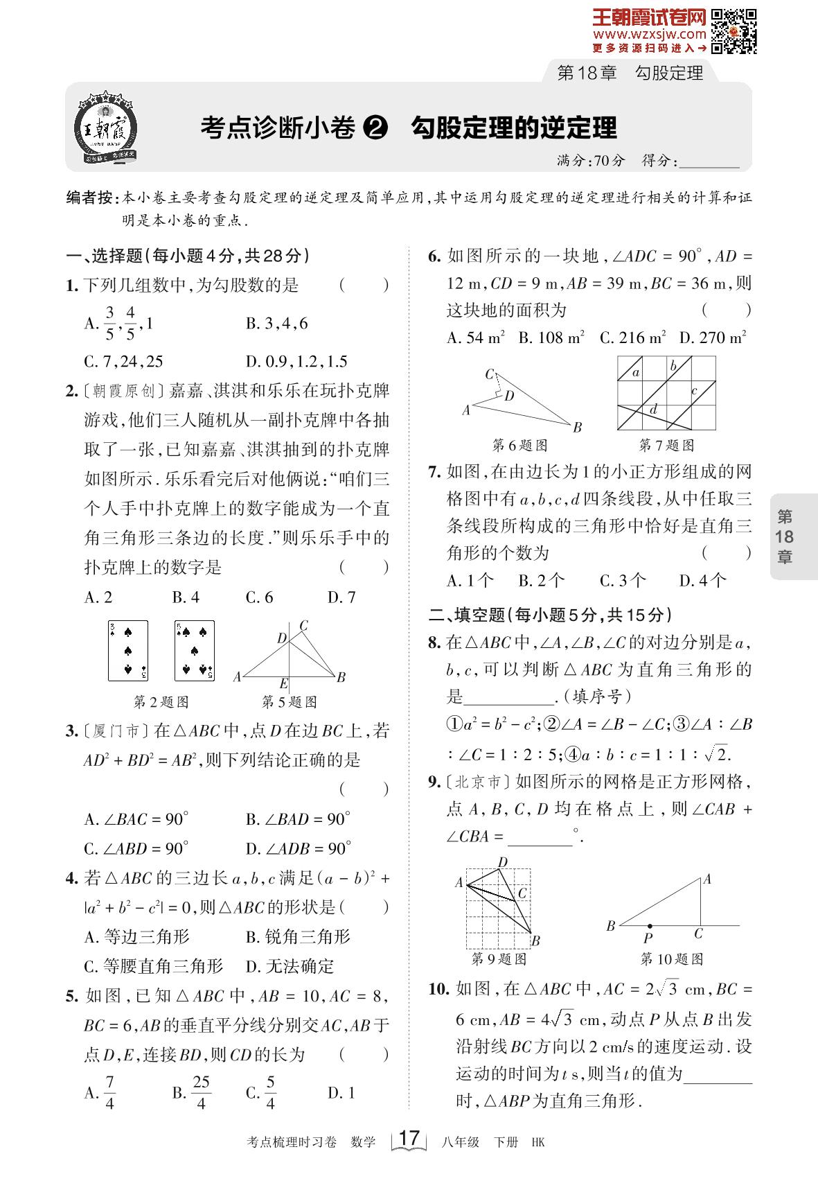 2023下册八年级数学沪科版 第18章 考点诊断小卷2 勾股定理的逆定理