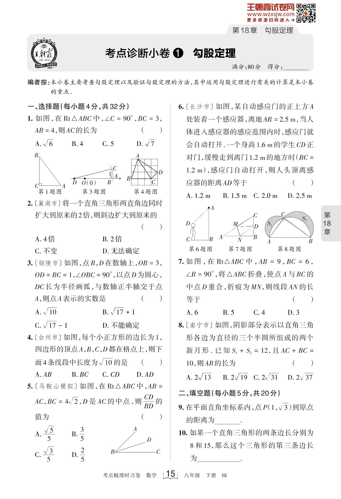 2023下册八年级数学沪科版 第18章 考点诊断小卷1 勾股定理