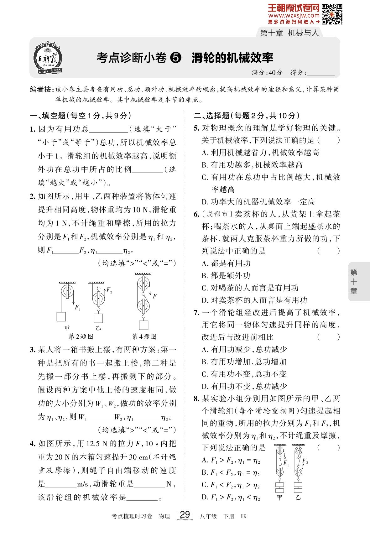 2023下册八年级物理沪科版 第十章 考点诊断小卷5 滑轮的机械效率