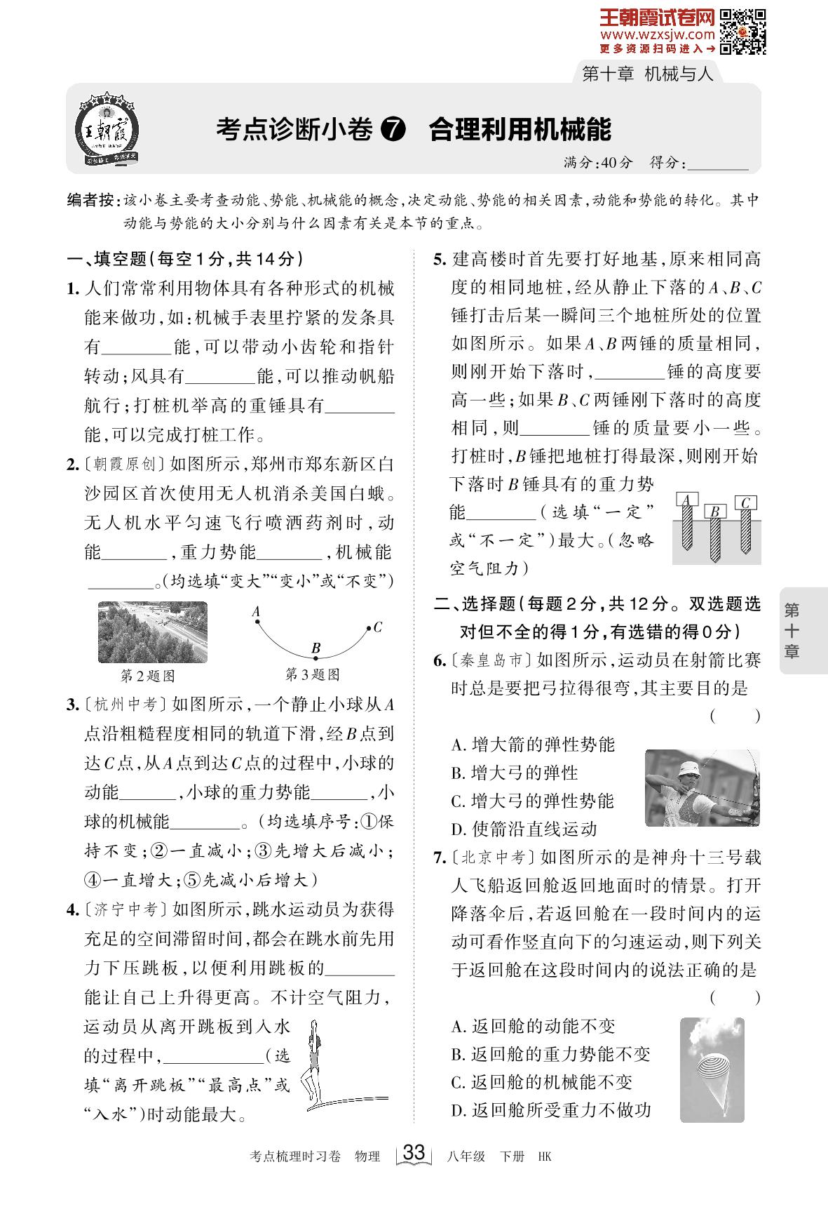 2023下册八年级物理沪科版 第十章 考点诊断小卷7 合理利用机械能