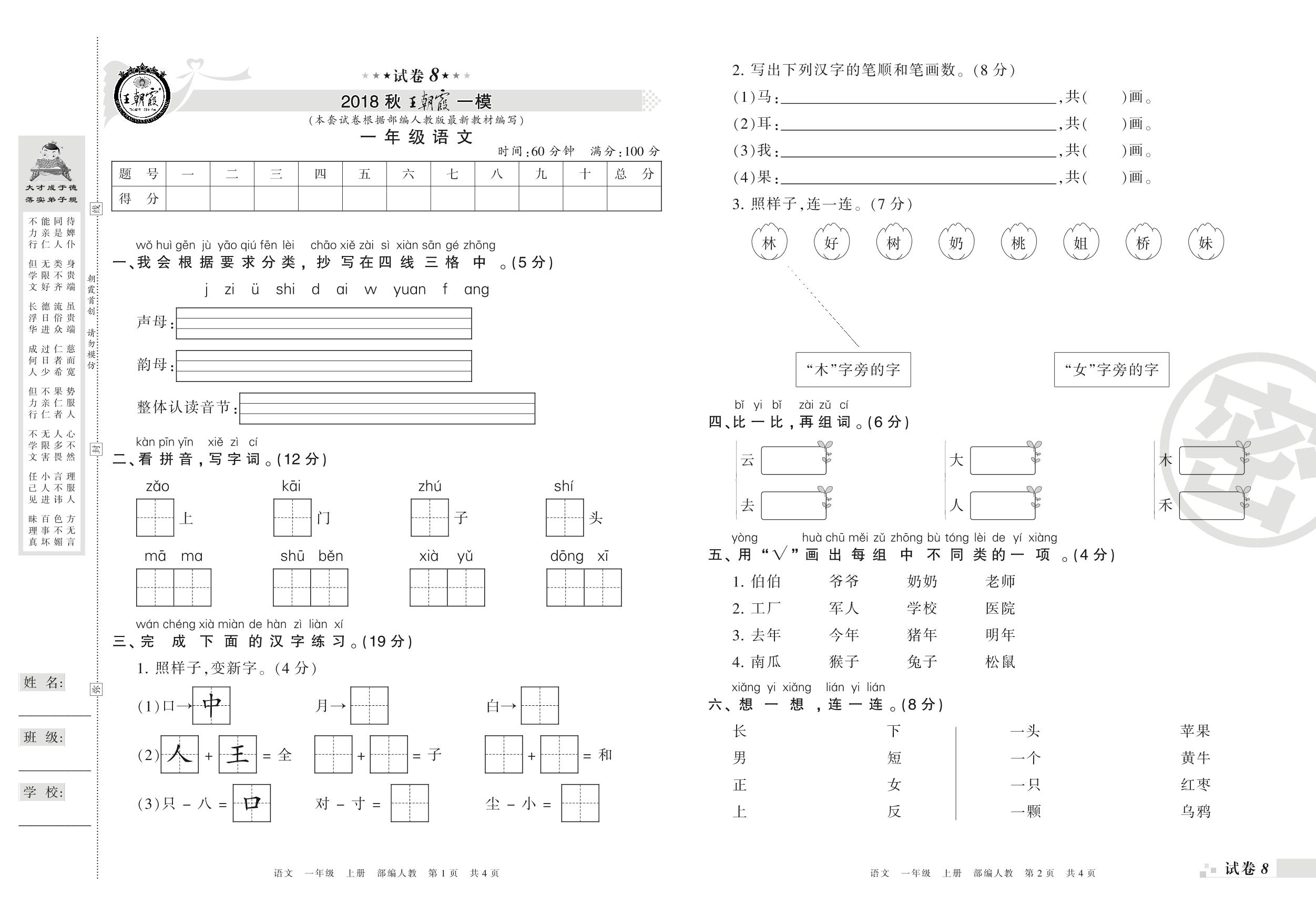 王朝霞期末模拟卷一年级上册语文(人教版)_R210731190141【8】