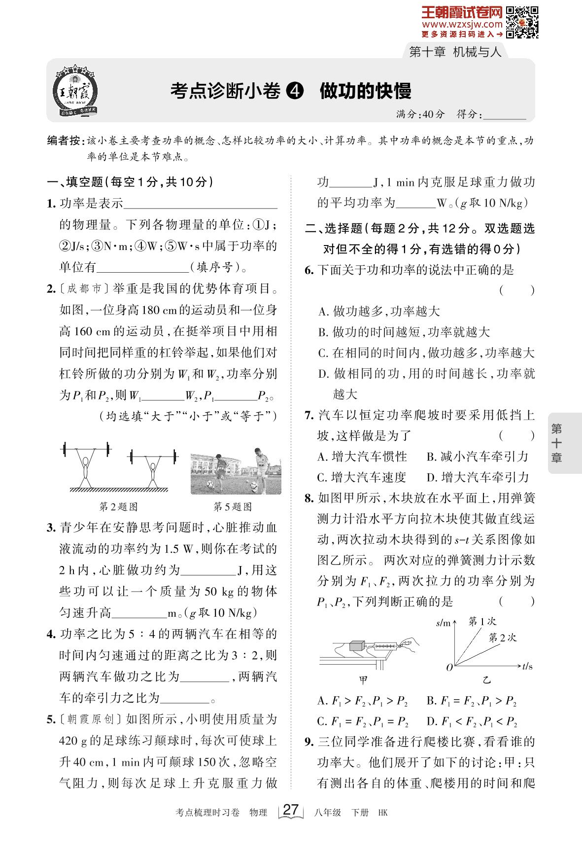 2023下册八年级物理沪科版 第十章 考点诊断小卷4 做功的快慢