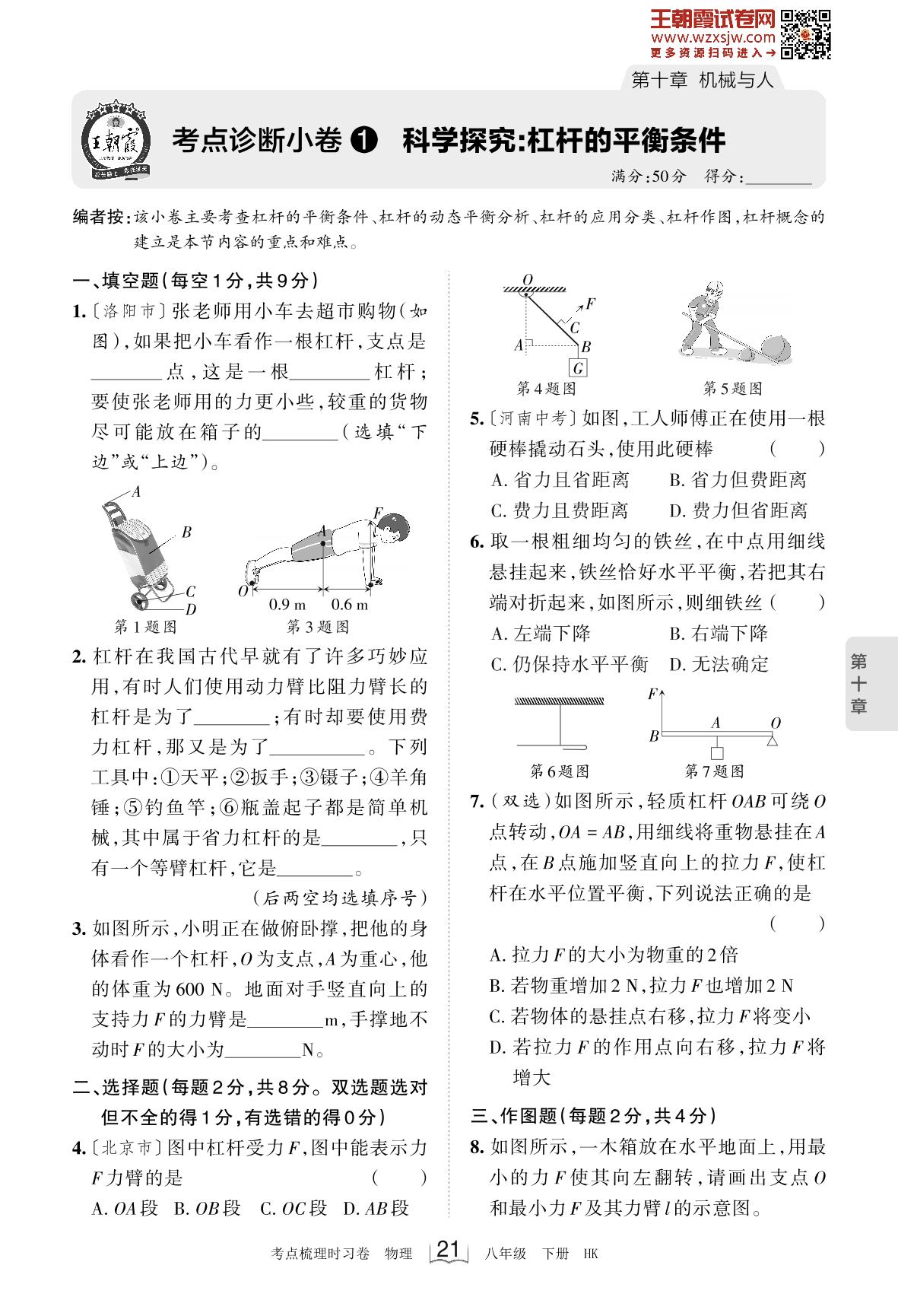 2023下册八年级物理沪科版 第十章 考点诊断小卷1 科学探究:杠杆的平衡条件