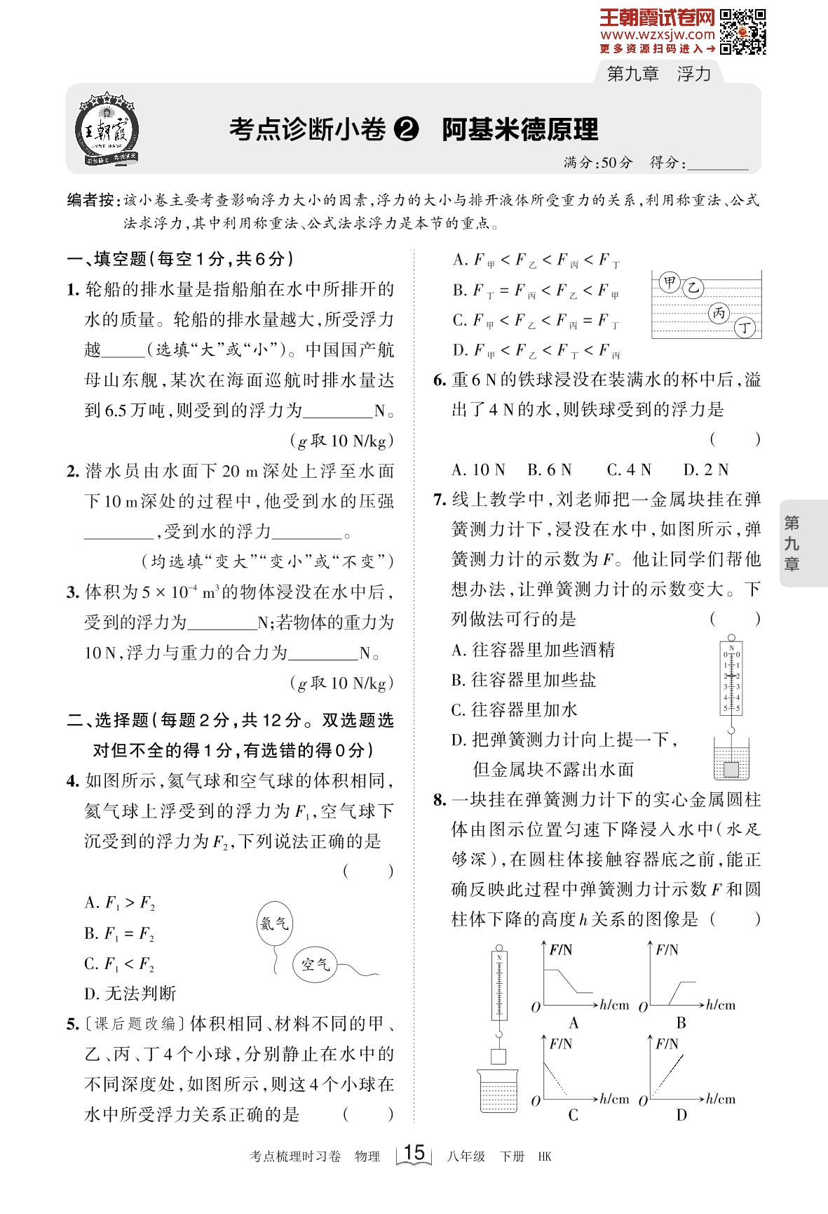 2023下册八年级物理沪科版 第九章 考点诊断小卷2 阿基米德原理