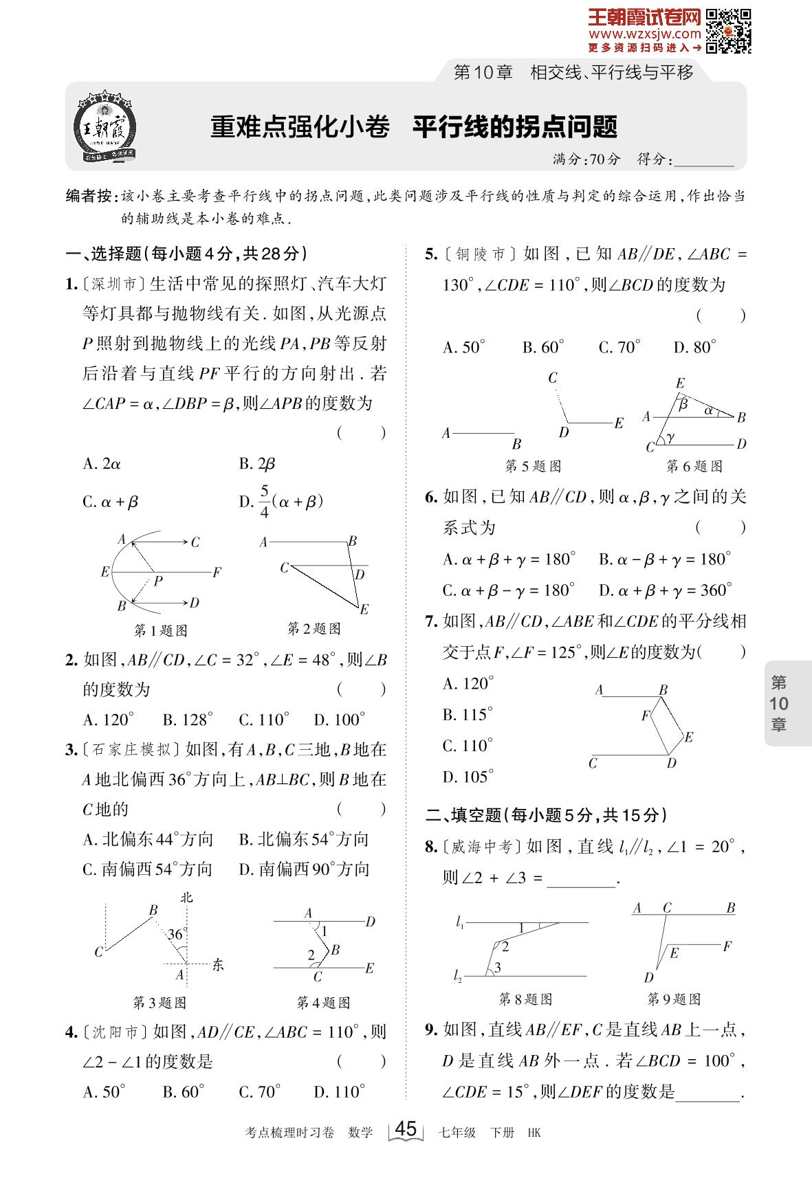 2023下册七年级数学沪科版 第10章 重难点强化小卷 平行线的拐点问题