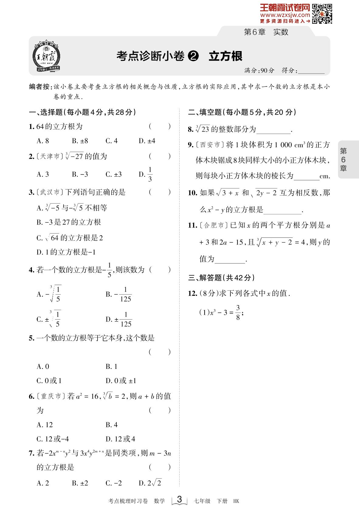 2023下册七年级数学沪科版 第6章 考点诊断小卷2 立方根