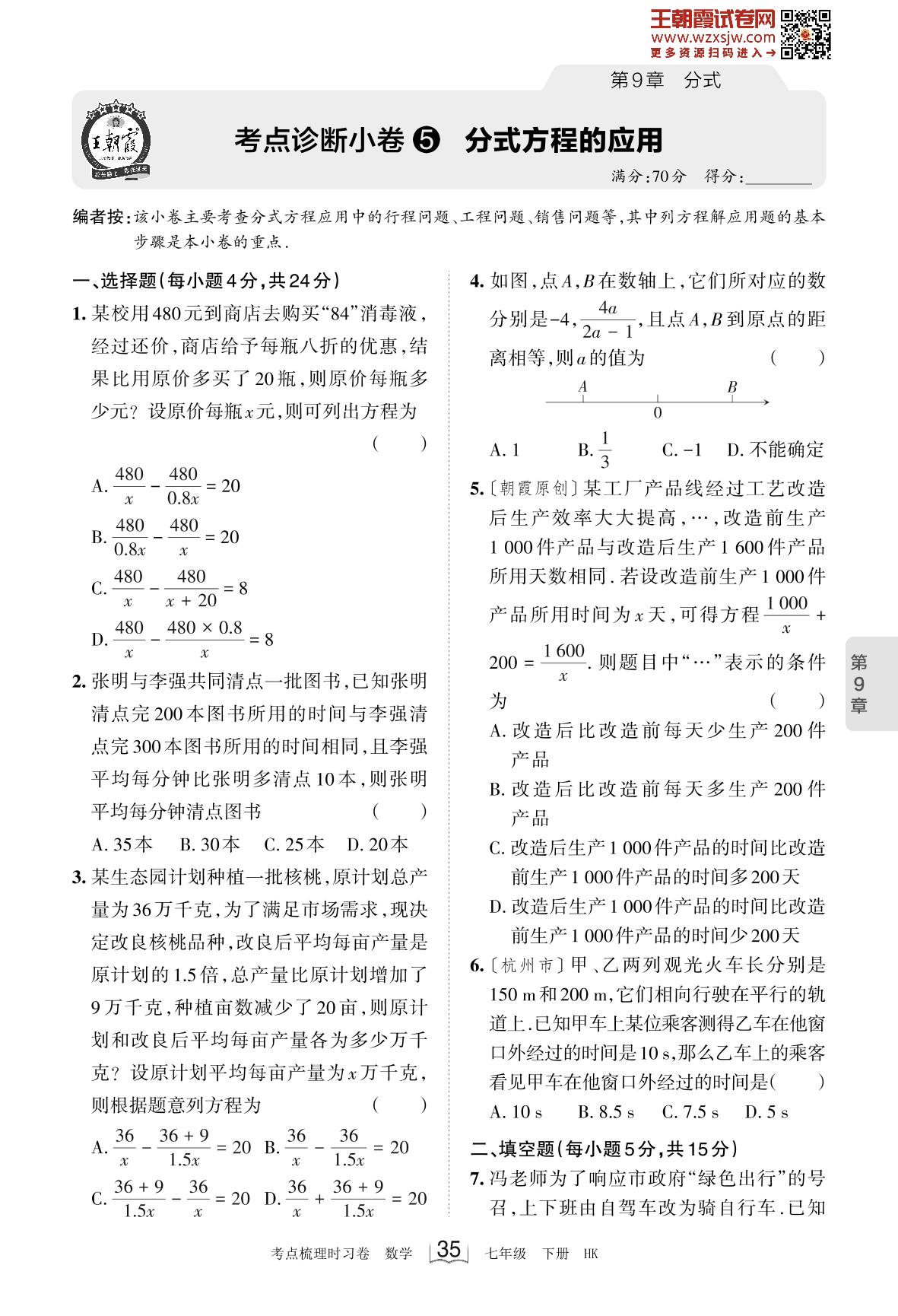 2023下册七年级数学沪科版 第9章 考点诊断小卷5 分式方程的应用