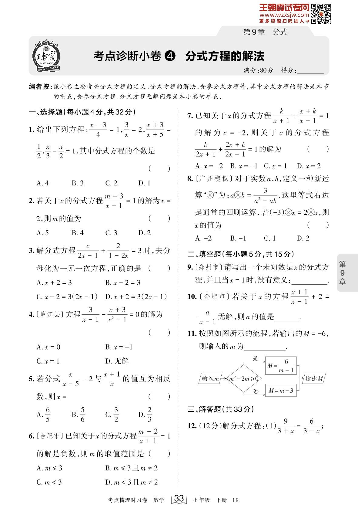2023下册七年级数学沪科版 第9章 考点诊断小卷4 分式方程的解法