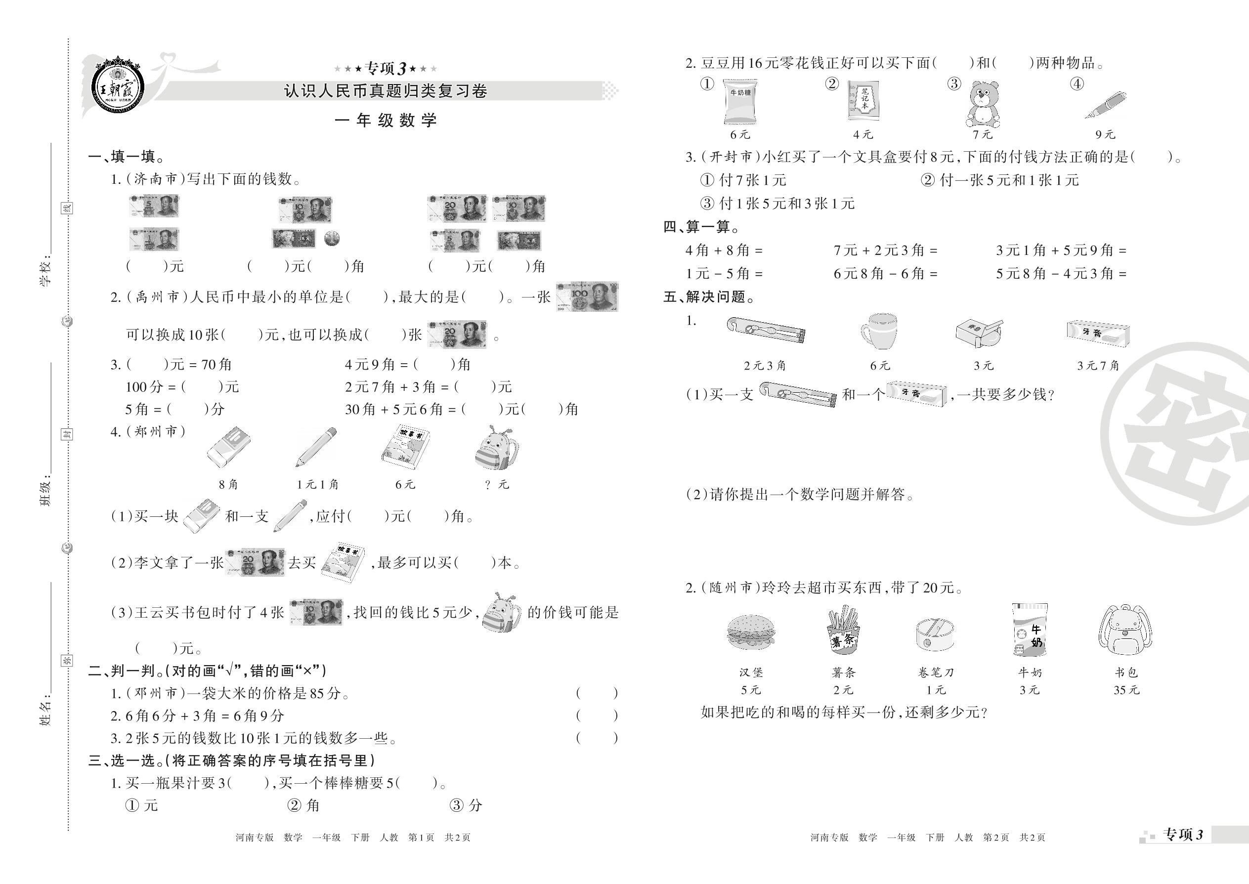 王朝霞期末专项卷——认识人民币、20以内的退位减法及找规律真题归类复习一年级下册数学(人教版)【0】
