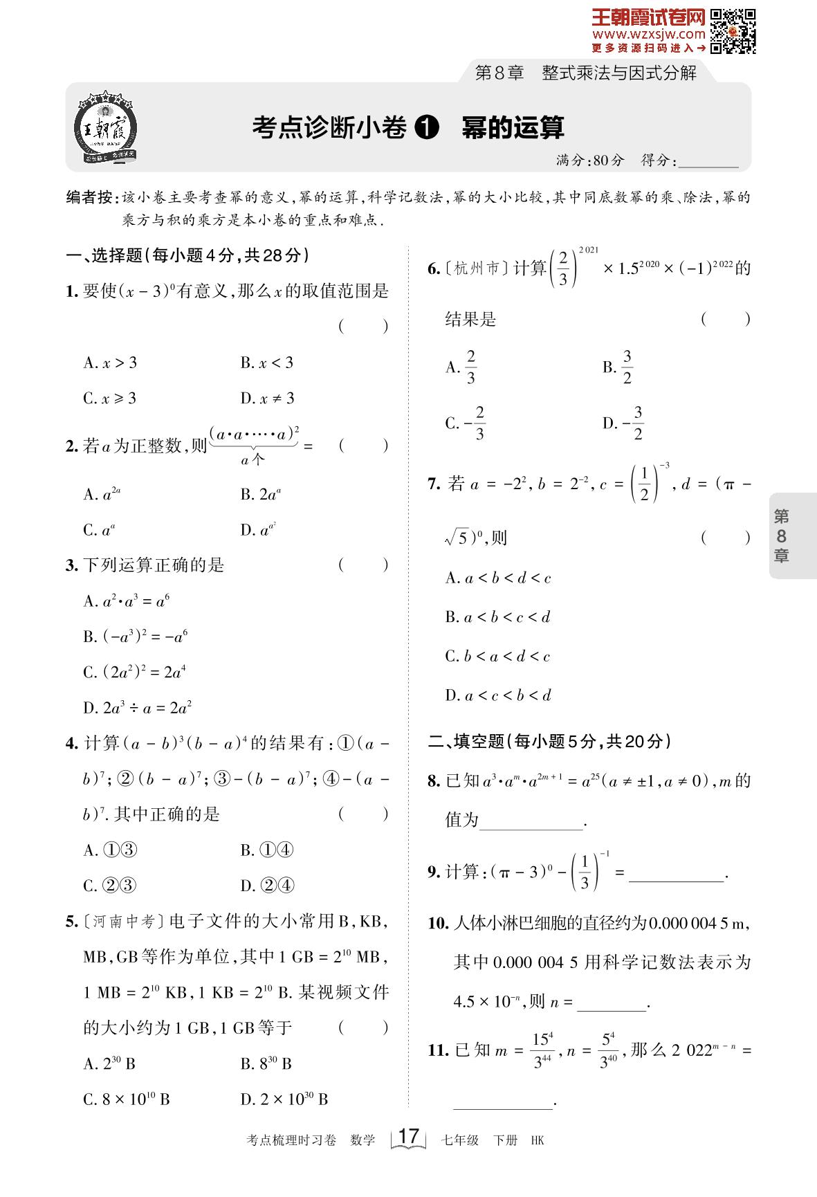 2023下册七年级数学沪科版 第8章 考点诊断小卷1 幂的运算