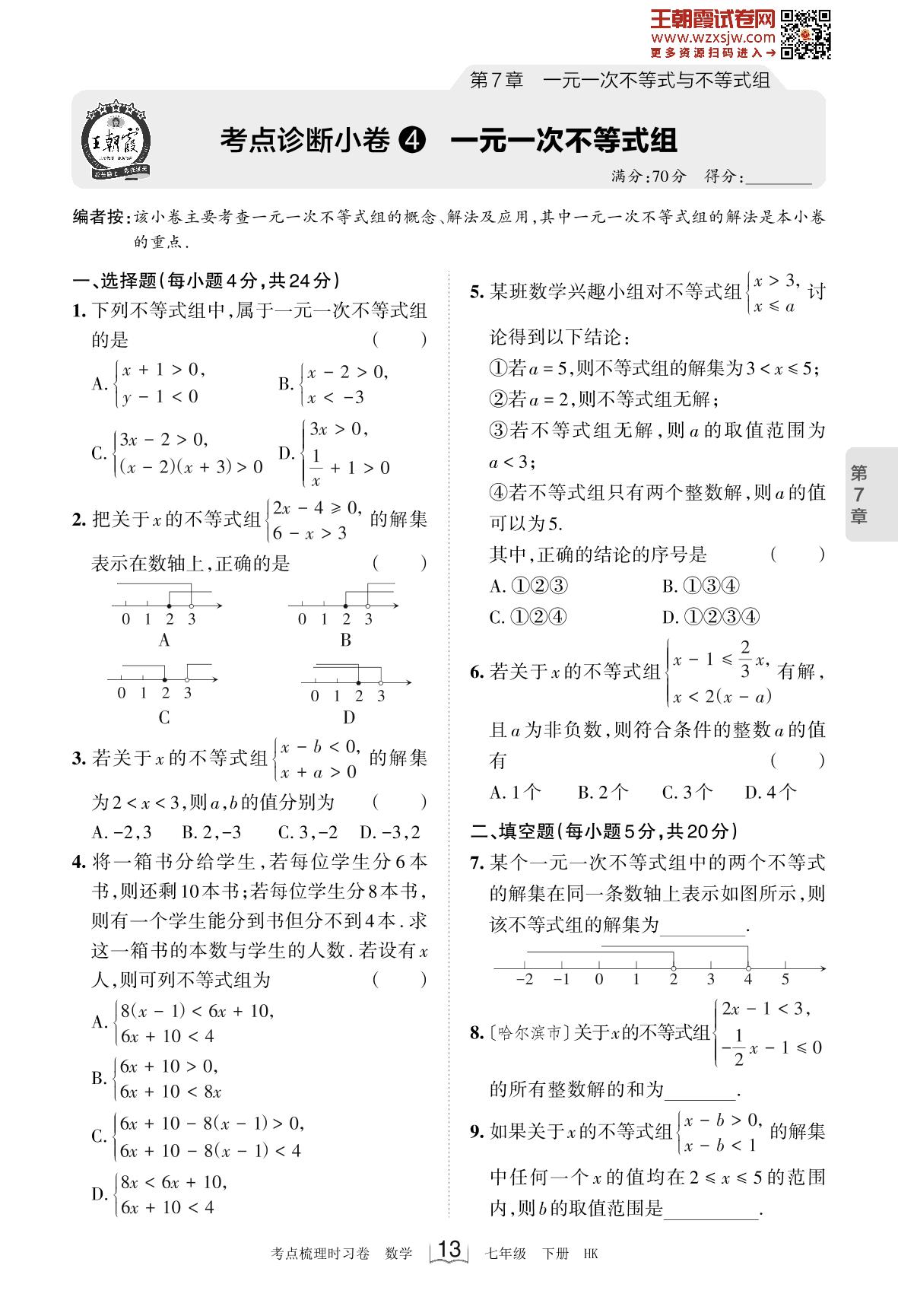 2023下册七年级数学沪科版 第7章 考点诊断小卷4 一元一次不等式组