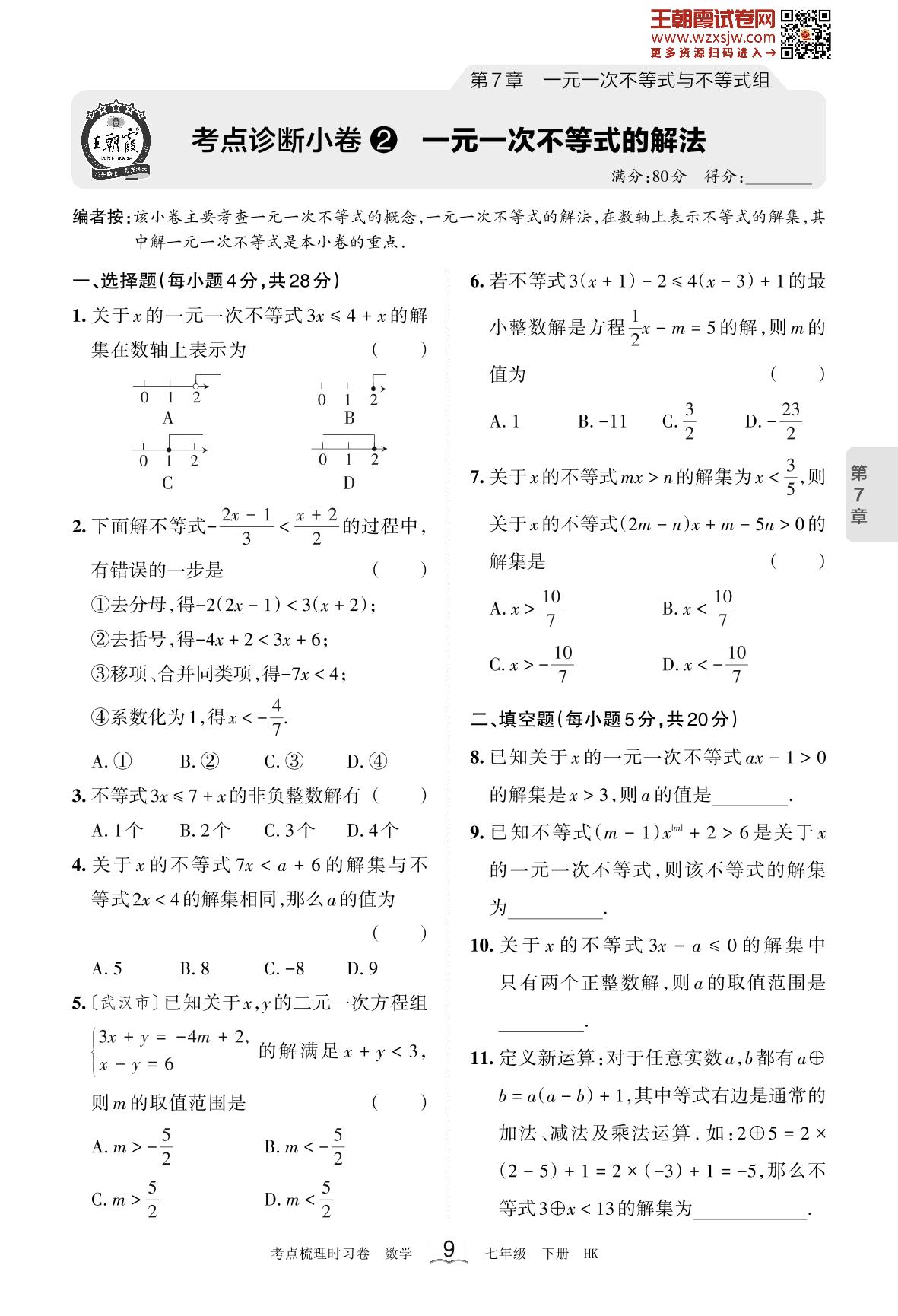 2023下册七年级数学沪科版 第7章 考点诊断小卷2 一元一次不等式的解法
