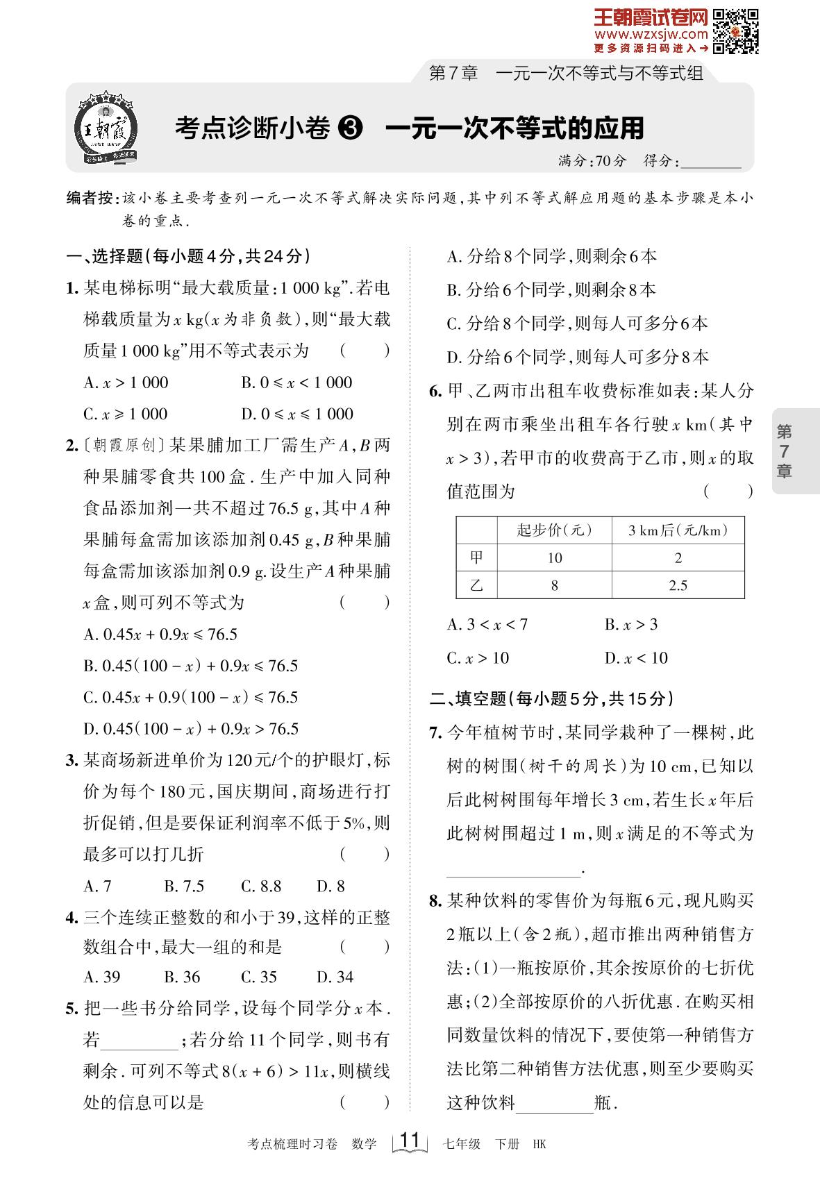 2023下册七年级数学沪科版 第7章 考点诊断小卷3 一元一次不等式的应用